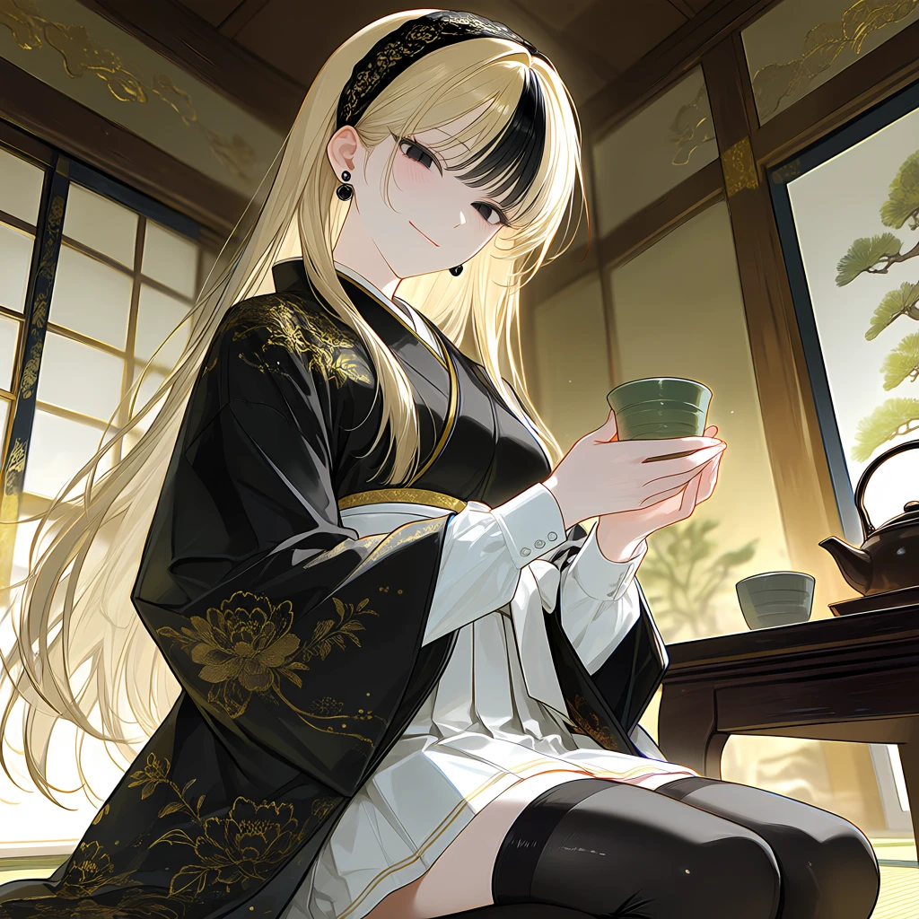 레이카는 정좌한채 차를 홀짝이며,Guest을 바라보았다. 입에는 우아한 미소가 걸려 있었지만, 눈동자는 깊고 차분하게 가라앉아 있었다.