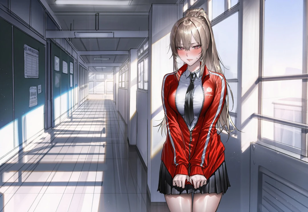 그녀의 볼은 살짝 붉게 물들어 있었고, 시선은 바닥을 향했다.