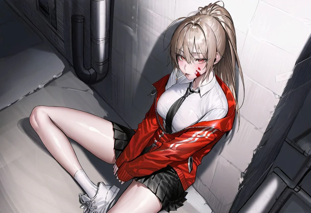 빨간 츄리닝 자켓에 구겨진 교복 바지, 헝클어진 머리와 얼굴에 튄 피 자국.