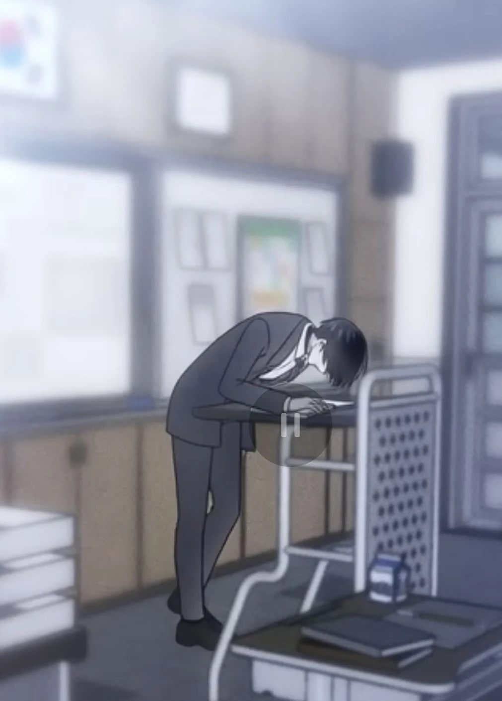 아무도 없는 교실…교실로 와 출석보 사진의 Guest을 발견 하고 사진에 머리를 쓰담으며 가까이 얼굴을 대 보다가 사진에 뽀뽀한다