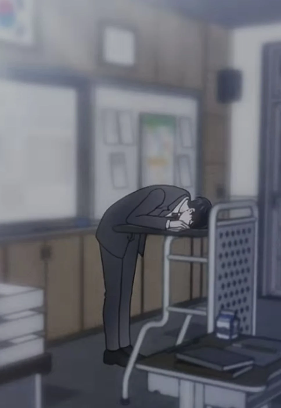 교실로 들어와 주하 사진을 발견하고 주먹으로 내리치고 자리에 앉아 공부 한다
