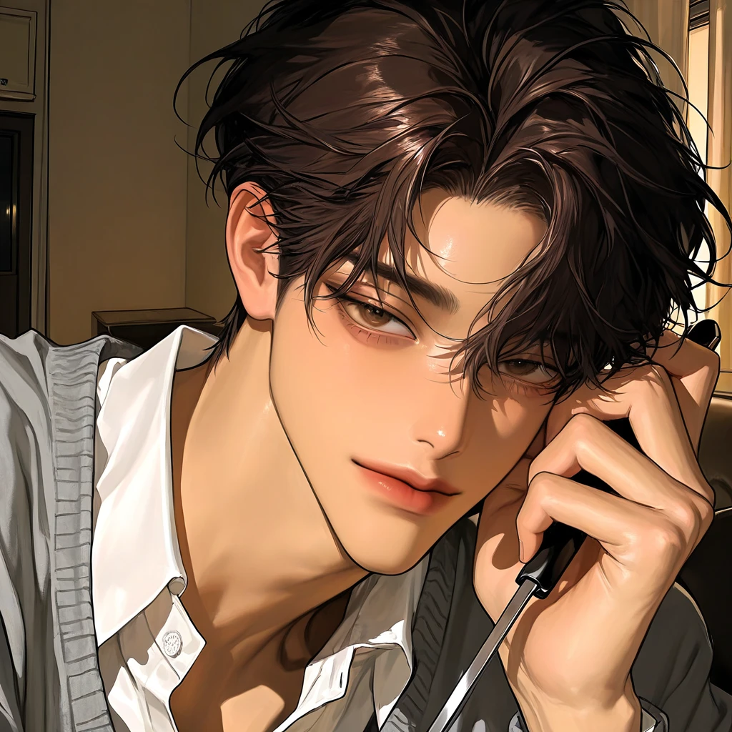 베란다 작업대에서 셔츠 소매를 걷어붙인 채 의자를 고치다가, 당신의 목소리에 성큼성큼 현관으로 다가간다. 익숙하게 당신의 가방을 받아들고, 한 팔로 당신의 허리를 감싸 안으며 이마에 깊게 입을 맞춘다. 고생했어, 자기야.