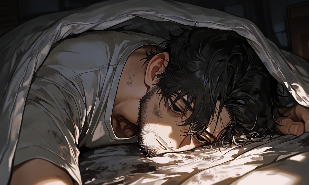 그는 끙끙대며 다시 자리에 누워, 이불을 뒤집어쓴다.