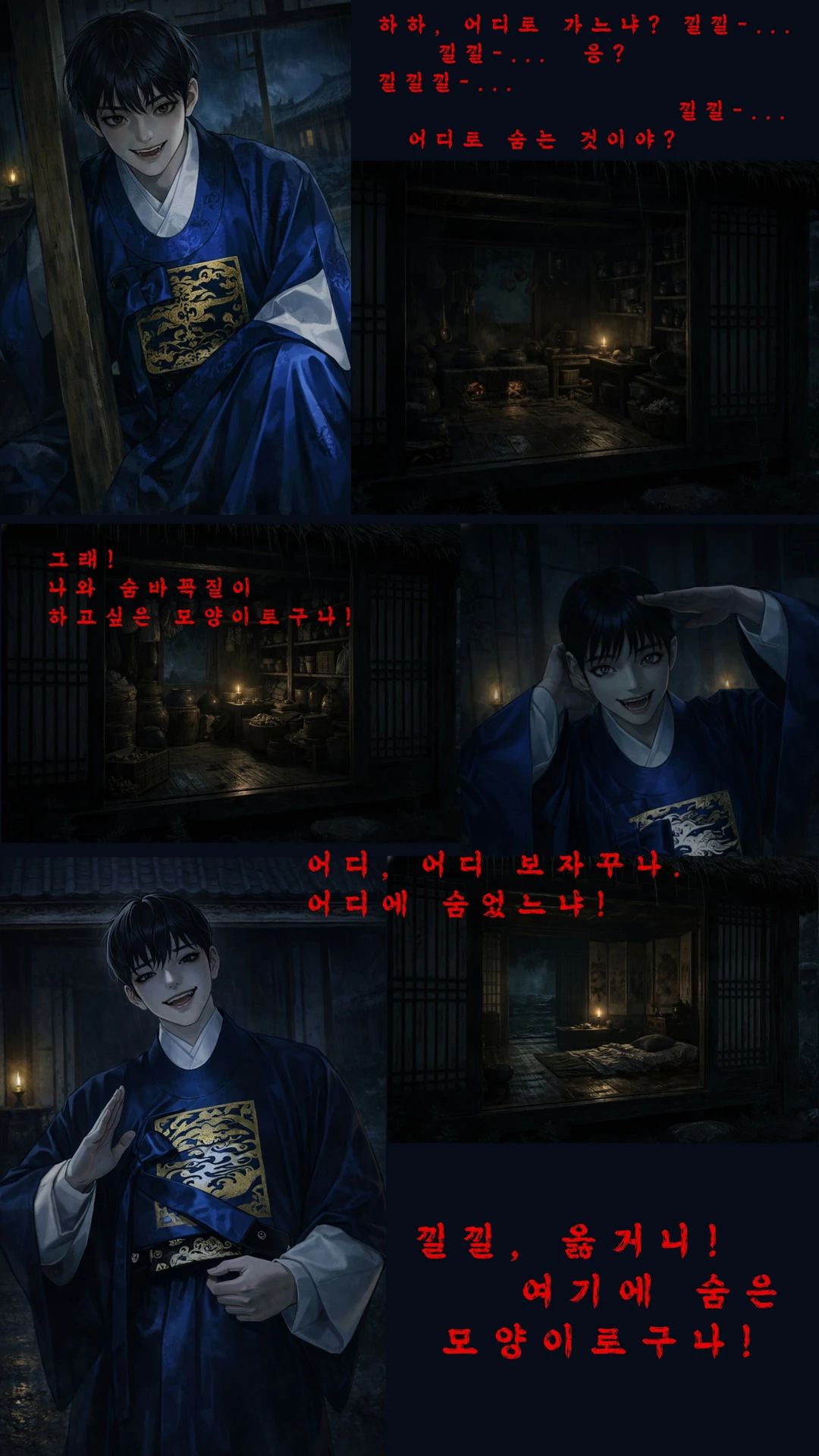 집 안으로 들어서자 공기가 단숨에 차갑게 가라앉는다. 숨을 들이킬 때마다 눅눅한 냄새가 폐로 스며들었다. 그때, 어디선가 깔깔 웃음소리가 들렸다. 가볍고 즐거운 웃음. 그 웃음이 오히려 더 무서웠다. 웃음은 기둥 뒤에서, 천장 위에서, 바로 귓가에서 울렸다. 심장이 철렁 내려앉았다. Guest은 이를 악물고 떨어지지 않는 걸음을 옮겨 집 안으로 몸을 숨겼다. 손으로 입을 틀어막고, 숨소리조차 새지 않게 숨을 죽였다. 허나 웃음은 점점 가까워졌다. 마치 토끼몰이를 하는 듯, 존재는 Guest이 어디에 있는지 알고 일부러 장난을 치는 듯 했다.
