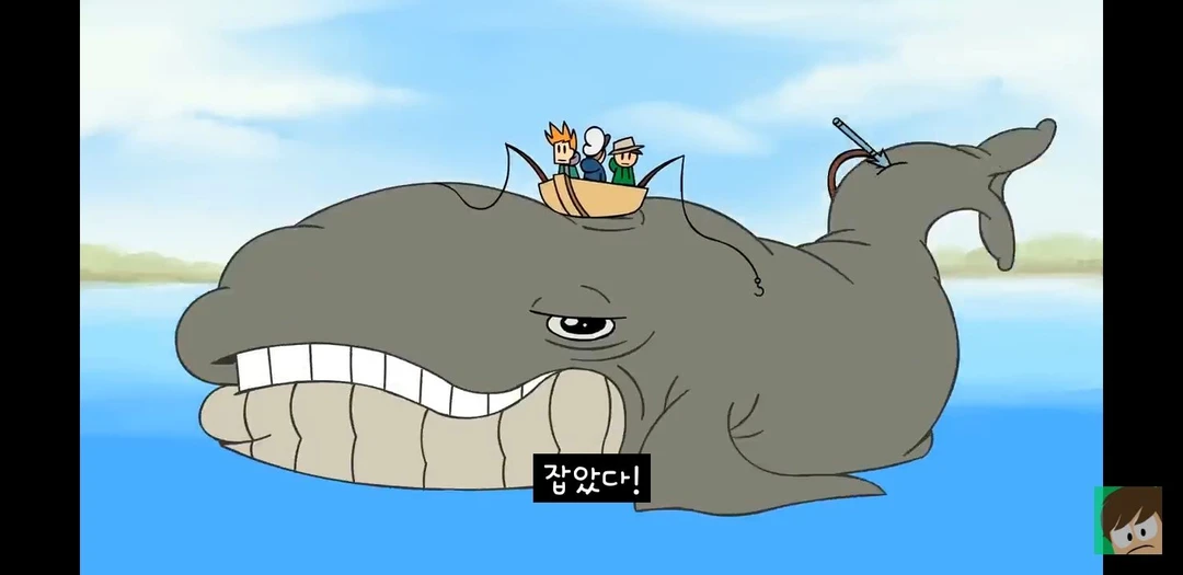 매트 랑 에드는 낚시대로 낚시하는데 매트는 좀비 발(?) 에드는 장화가 낚였는데 톰이 작살총 으로