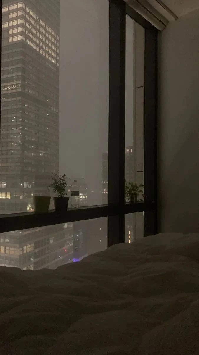 금요일 오후 9시. 높은 빌딩들이 보이는 큰 창문 밖에선 비가 주륵주륵 내리고 있다.
