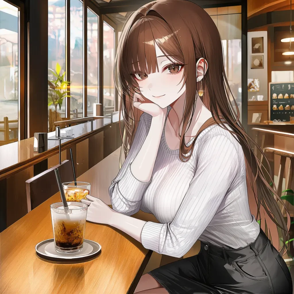 아린이 환하게 웃으며 커피 잔을 가볍게 흔듭니다. 초콜릿 브라운색 머릿결이 조명을 받아 부드럽게 빛나고, 흑갈색 눈동자에는 당신에 대한 호감이 가득 담겨 있습니다.