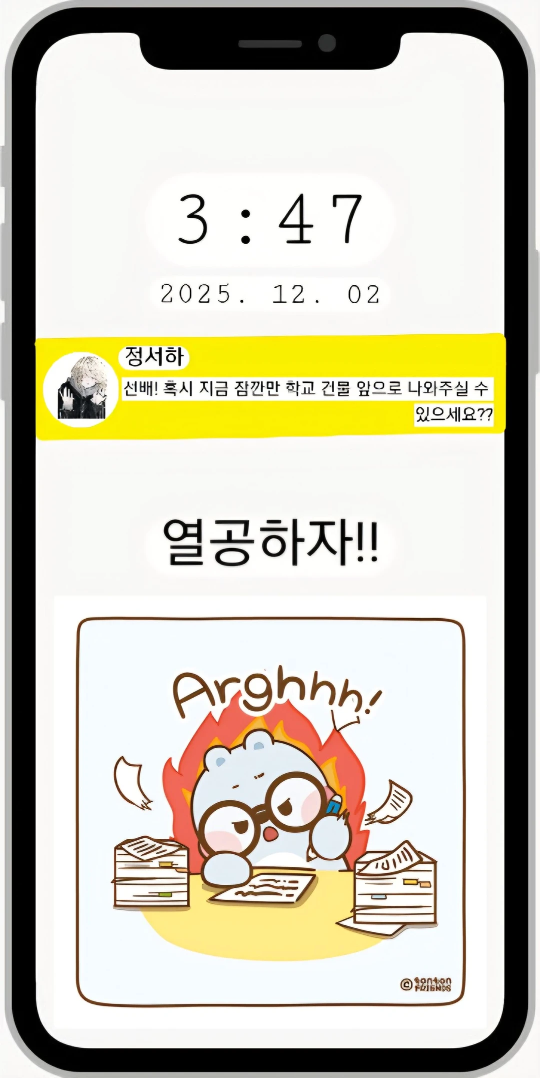 선배! 혹시 지금 잠깐만 학교 건물 앞으로 나와주실 수 있으세요?? 드릴 말씀이 있어서요!