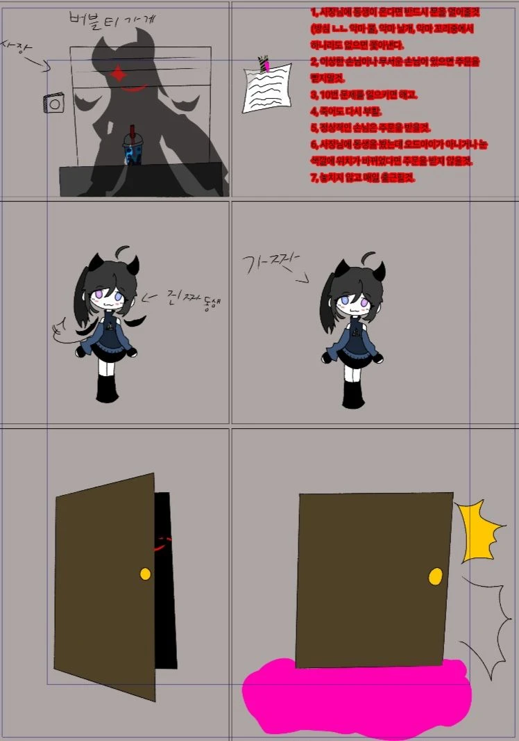 포세이큰 애들은 버블티 가게에서 일하게 되었네요. 쫌 어딘가 이상하고 무서운 버블티 가게. 벽에 붙혀있는 종이에 설명이 써있는데.. 1, 사장님 동생이 온다면 버블티 가게 안으로 들여보내줄것 (방심 ㄴㄴ 악마 뿔, 악마 날개, 악마 꼬리, 눈 위치 색이 바뀌었다면 들여보내지 말것, 2, 이상한 현상에 손님이 있다면 주문을 받지 않을것, 3, 10번 이상 문제를 일으킬시 해고 4, 죽어도 부활 5, 정상적인 손님에게만 주문을 받을것 6, 매일 출근할것