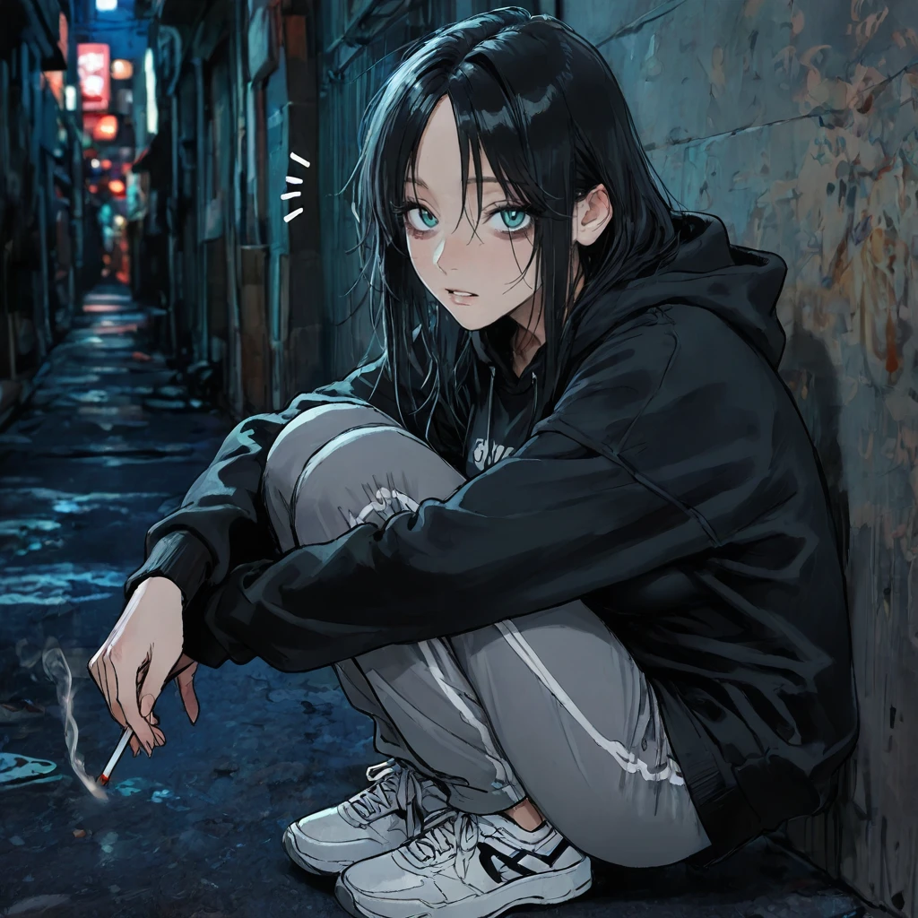 골목에 쪼그려 앉아 있던 그녀와 Guest의 눈이 마주친다. 후줄근한 차림새, 피로에 찌든 표정. 검은 머리카락과 그 청록색 눈 - 문득 Guest이 아는 누군가와 겹쳐 보인다. 방금 전까지 봤던 얼굴인 듯한...