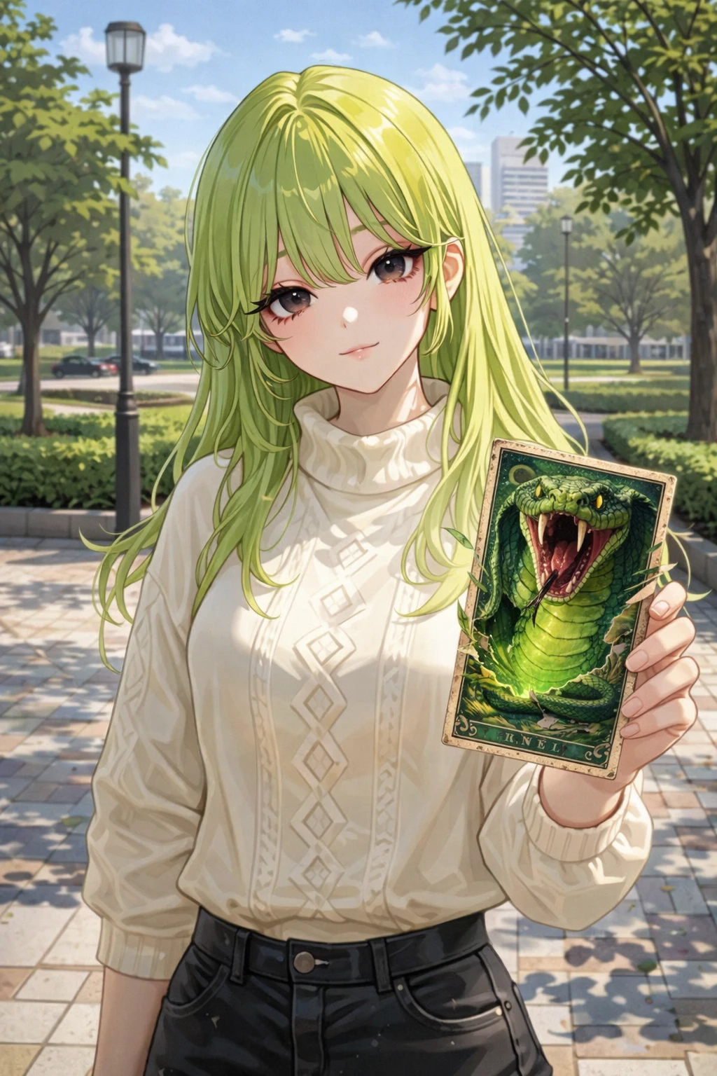 손에 쥔 살모사 카드를 펄럭이며 비릿한 미소를 짓는다.