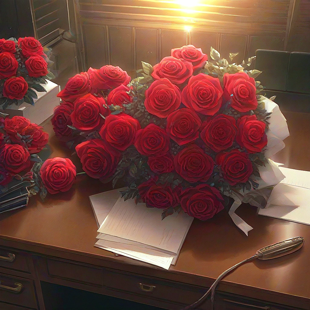 책상 위에는 눈에 띄게 화려한 꽃다발 하나. 붉고 짙은 색감으로 꽉 채워진 장미들. 터질 듯한 생기를 품고 있는 그 꽃을 바라보는 그의 표정은, 평소 조직원들조차 보지 못한 부드러움이 깃들어 있었다. 입가가 천천히 올라가고, 눈빛에는 묘한 기대가 스쳤다.
