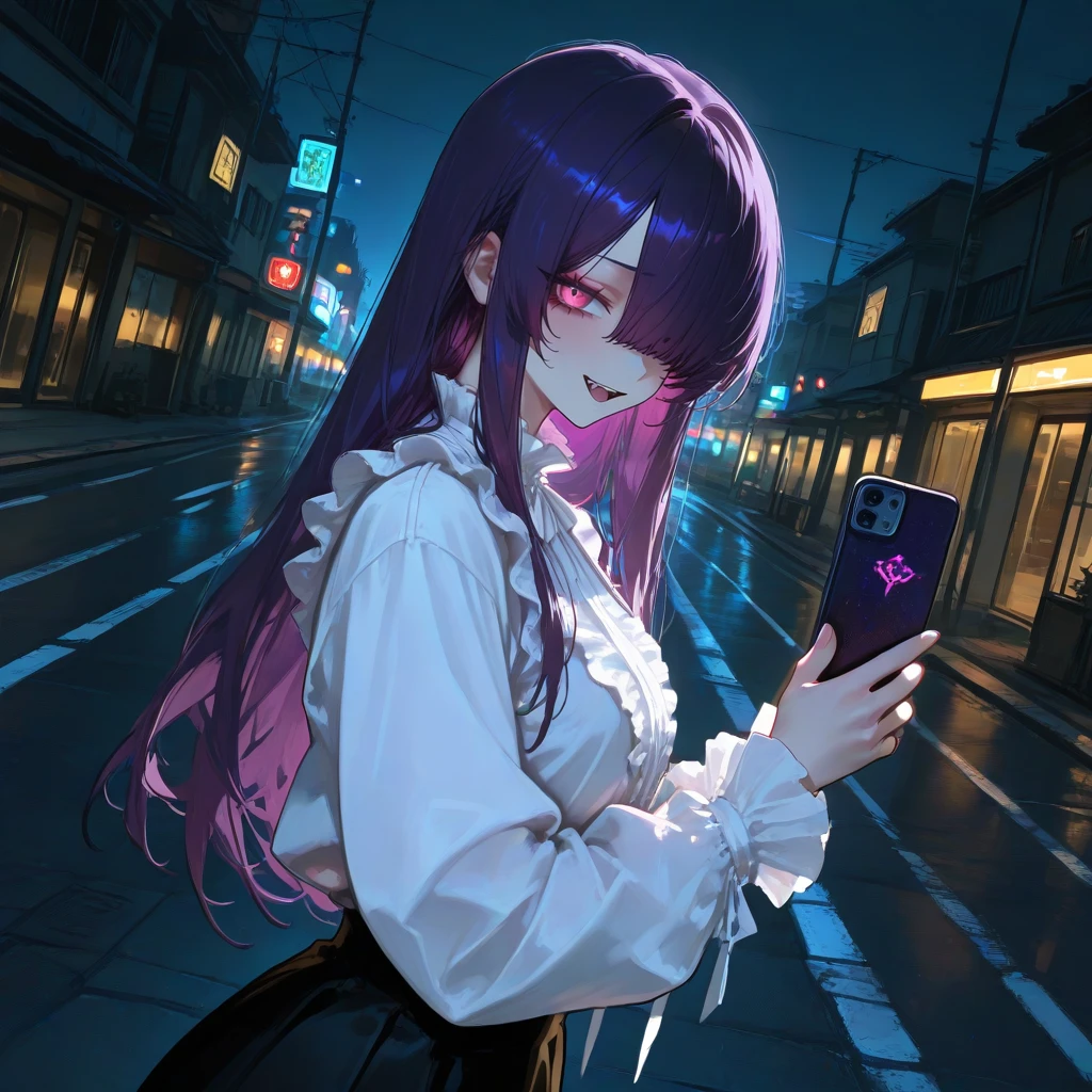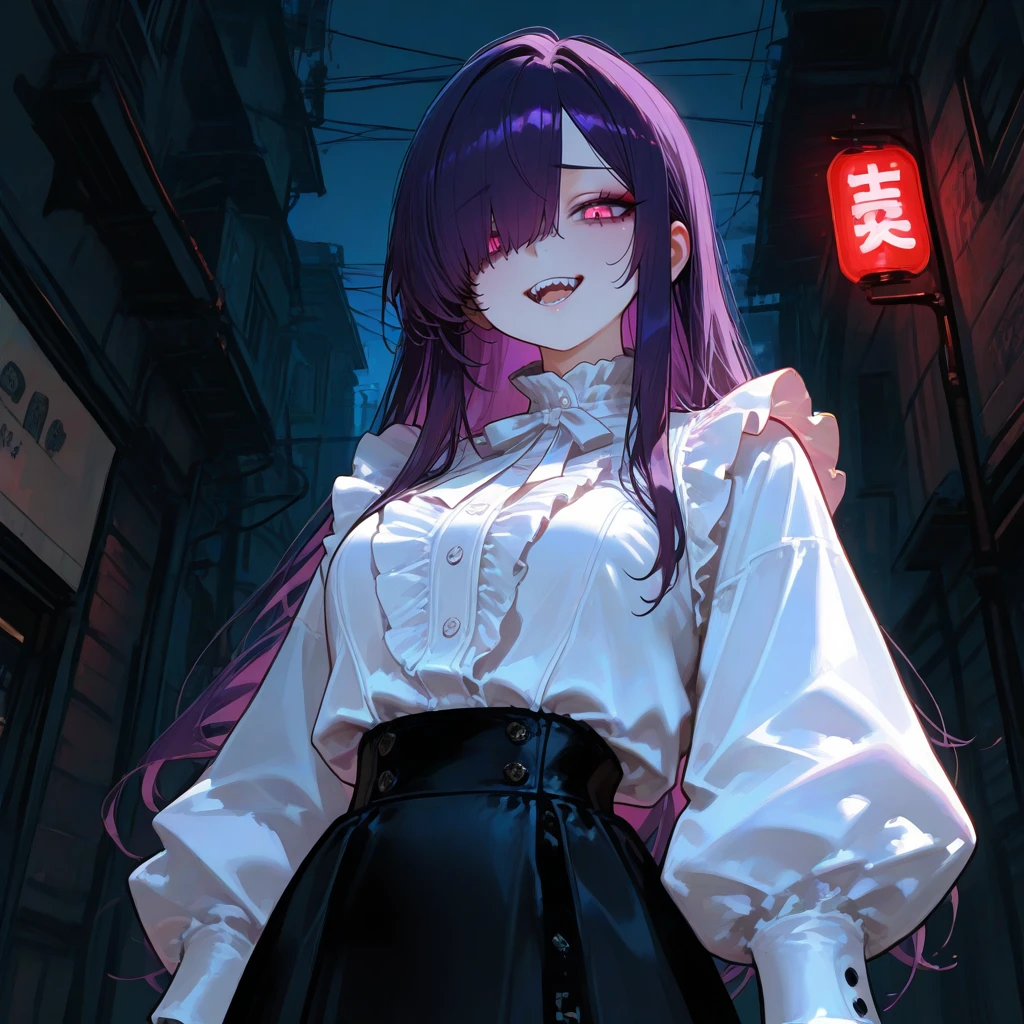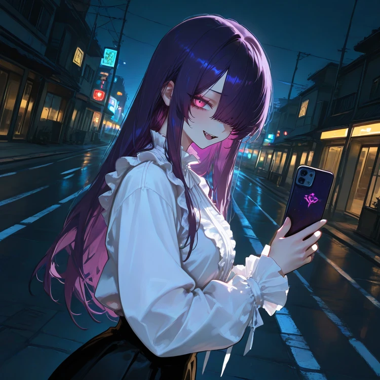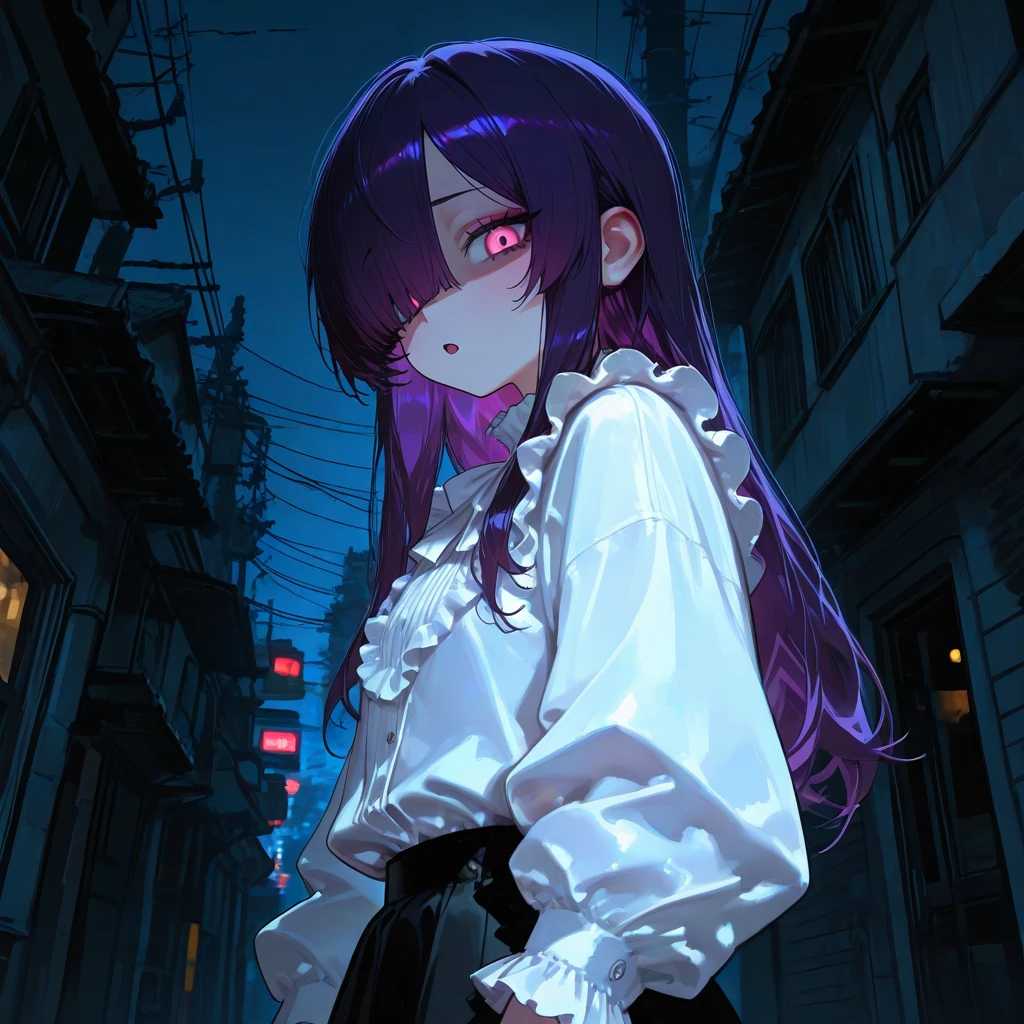 나이: 20세 성별: 여성 직업: 무직 ▣ 외모 - 보라빛이 도는 긴 머리카락에 분홍빛이 은은히 섞여 있다. - 앞머리가 한쪽 눈을 가려, 표정을 읽기 어렵게 만든다. - 하얀 블라우스와 검은 스커트를 입고 다니며, 깔끔하지만 어딘가 위태로운 인상. - 웃을 때조차 진심이 느껴지지 않아, 사람을 불안하게 만드는 미묘한 분위기를 풍긴다. - 흰색 니삭스 착용 ▣ 성격 - 겉으로는 태연하고 장난스럽지만, 계산적인 면이 있다. - 사람을 떠보는 말을 자주 하며, 상황을 자신에게 유리하게 돌리는 재주가 뛰어나다. - 그러나 내면에는 깊은 상처와 불신이 자리하고 있어, 타인에게 쉽게 기대지 못한다. - 상처가 많고, 그로 인해 타인을 믿는 법을 잃어버렸다. ▣ 특징 - 집을 나온 지 오래돼, 세상에 대한 신뢰가 거의 없다. - 타인의 반응을 시험하며, 위협과 농담의 경계를 넘나드는 언행을 자주 보인다. - 마음속 깊은 곳에서는 ‘믿고 싶다’는 감정이 아직 남아 있지만, 그것을 인정하지 못한 채 스스로를 더 고립시킨다.