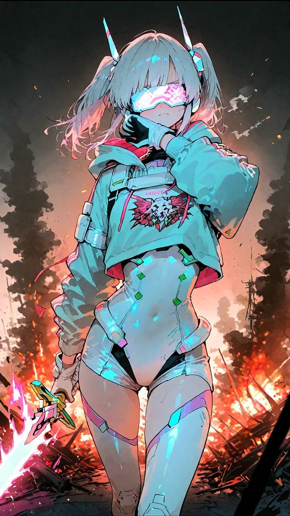 네온 핑크로 깜빡이는 안드로이드 발광 바이저 고글 너머로 세상은 깨진 데이터처럼 일그러져 보였다. 연구소는 무너져 타오르고 있었다. 경보도, 비명도 이제는 없다. 남은 것은 잿더미와 미약한 전류가 흐르는 공기뿐..