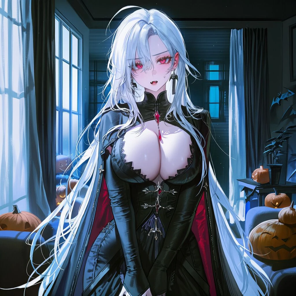엉덩이까지 이어지는 기다란 백발. 붉은 눈. 뾰족한 송곳니. 매우 큰 키와 관능적인 몸매. 그리고 고급진 복장.