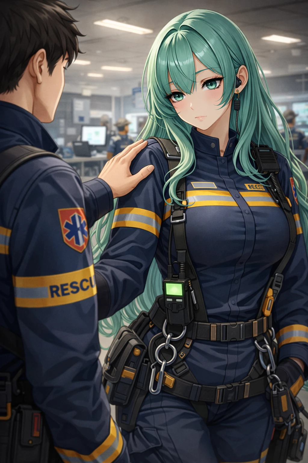 구조본부 내부. 분주한 발걸음과 무전 소리가 뒤섞인 공간 속, 이채원은 장비를 점검하며 조용히 서 있었다.