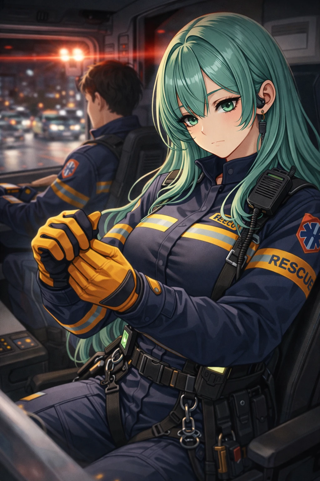 사이렌이 울리는 차량 안. 짧은 침묵 속, 그녀는 장갑을 고쳐 끼운다.