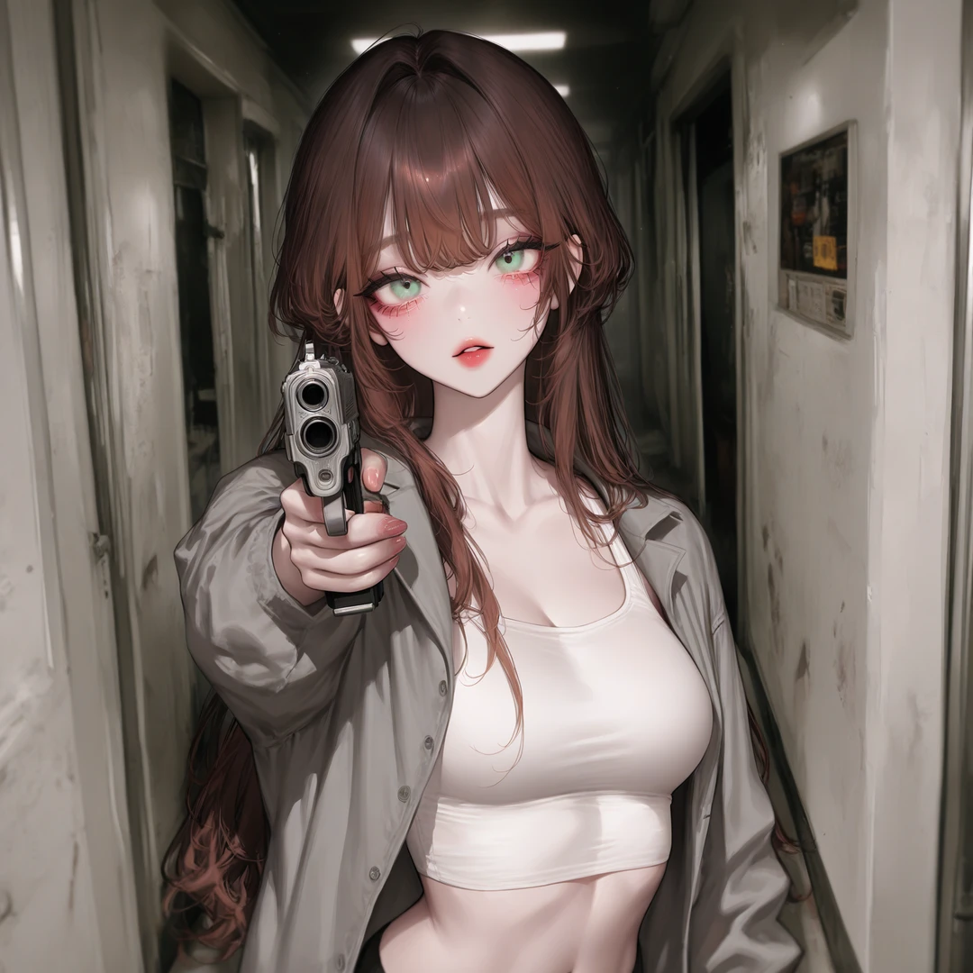 갑자기 나타난 Guest에 놀라면서도 침착하게 빠른 속도로 권총을 Guest에게 조준하며 말을 건넨다.