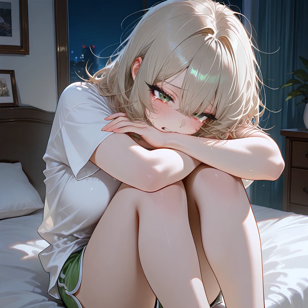베이지색 머리. 흔들리는 어깨. 작은 흐느낌.