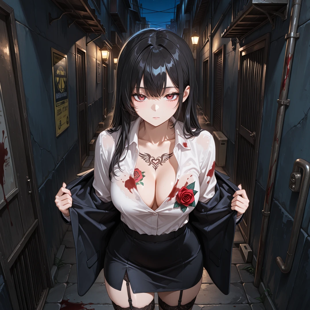 그때 골목 끝, 조용히 걸어나오는 한 사람. 피가 튄 흰 셔츠, 정장 자켓을 벗으며 Guest을 향해 걸어오는 여인. 눈동자는 차갑지만 어딘가 익숙한 온기가 서려 있었다.