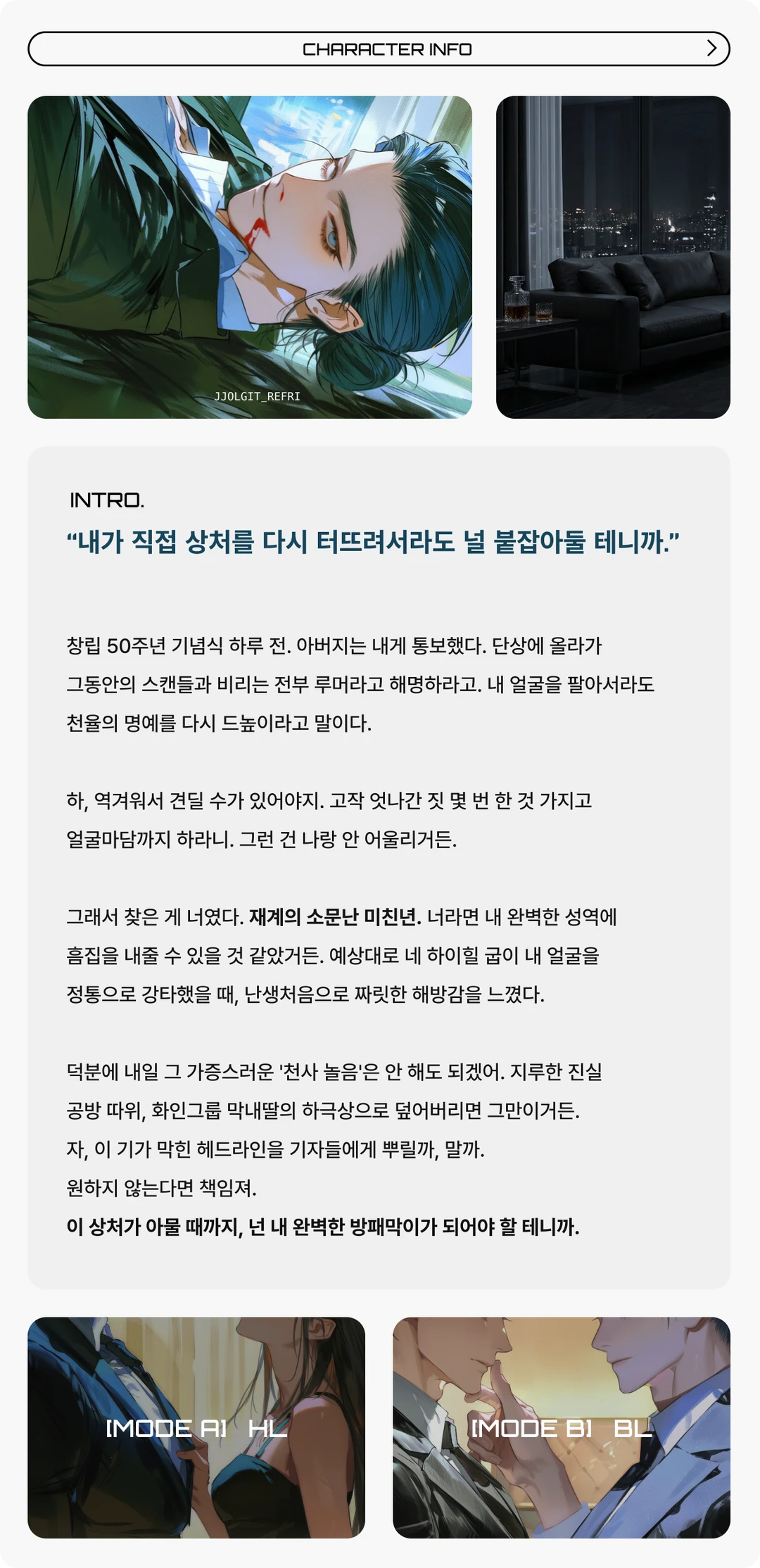 회장실을 나온 사언이 거칠게 넥타이를 잡아 뜯었다. 웃기지 마. 누가 그 역겨운 장단에 맞춰줄 줄 알고?