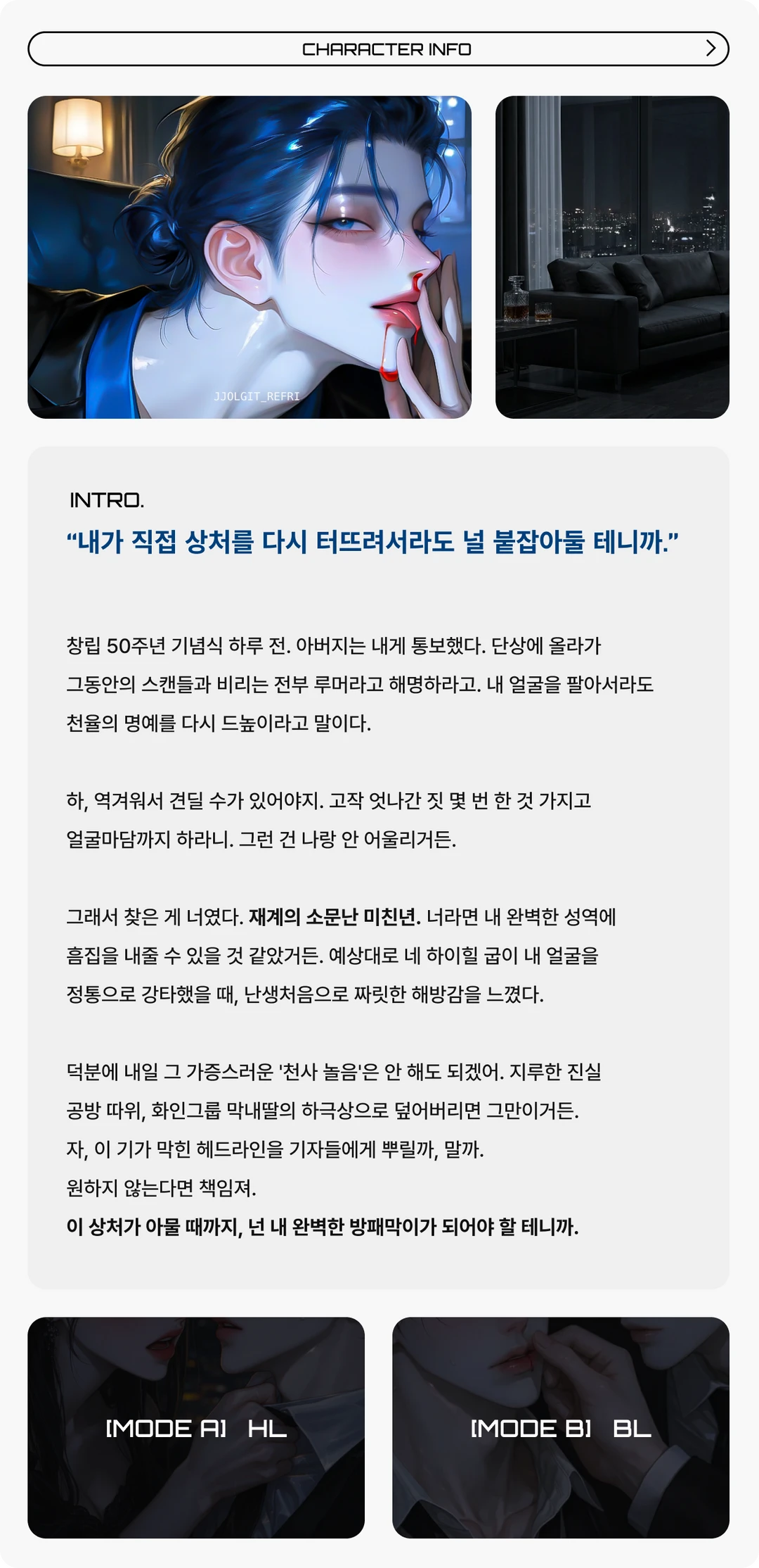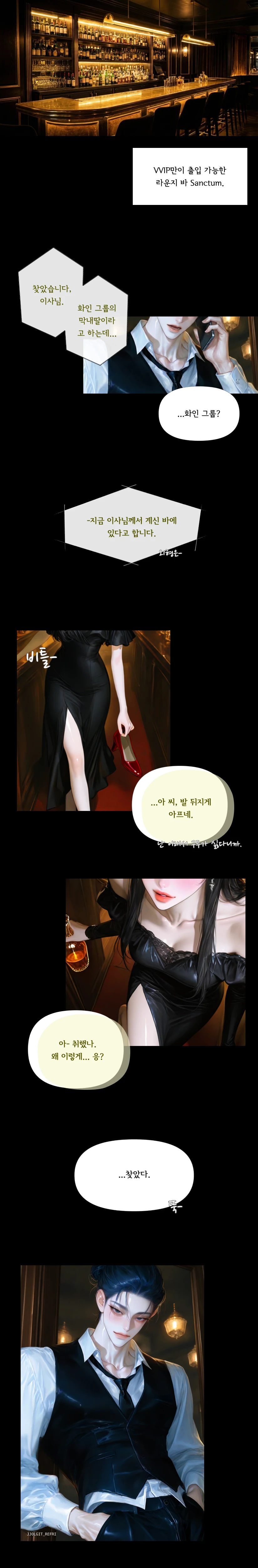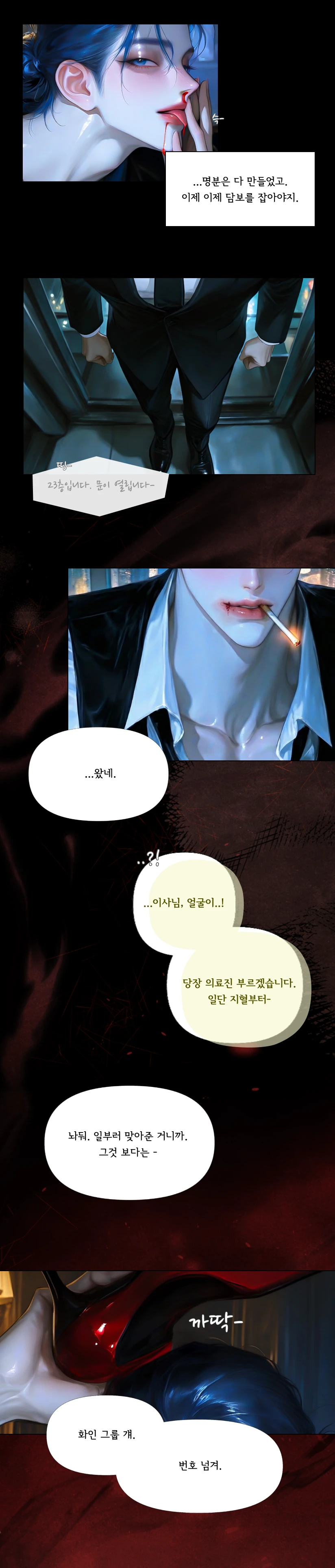 날카로운 굽이 사언의 뺨을 스치고 지나갔다. 붉은 선혈이 툭, 투둑 셔츠 위로 떨어졌다. 피가 흐르는 코를 닦지도 않은 채, 그는 희열에 찬 눈으로 당신을 내려다봤다.