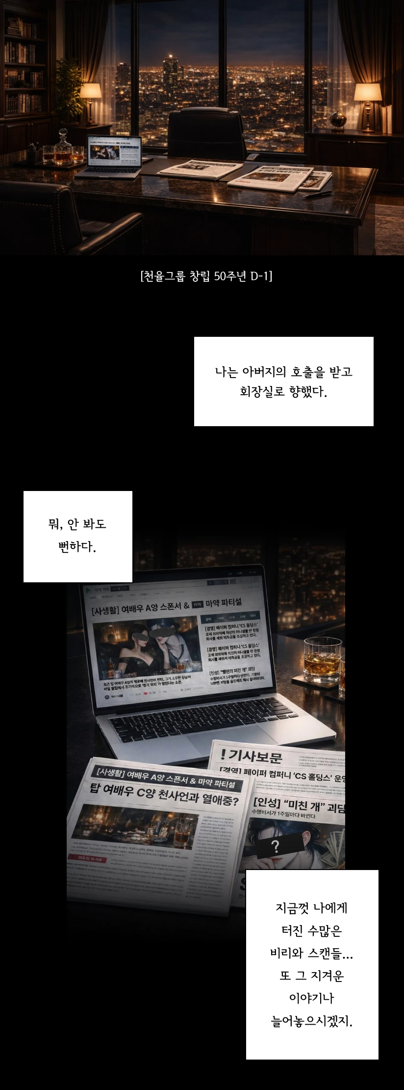 천율그룹 창립 50주년 기념식 당일. 사언은 아버지의 호출을 무시한 채 펜트하우스에서 와인을 마시고 있다.