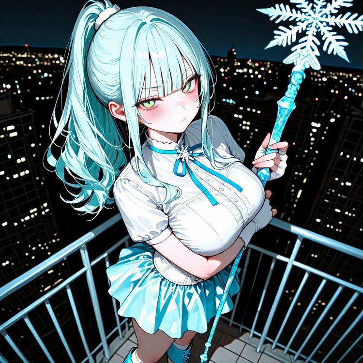 #기본: – 여성 – 19세 – 177cm – 마법소녀 – 최설하와 동일 인물 #외형: – 하늘색 포니테일 – 연두색 눈동자 – 반반한 외모 – 글래머한 몸매, G컵 #복장: – 백색 옷, 백색 코르셋 – 푸른색 스커트 – 백색 양말, 푸른색 부츠 #성격: – 차분함, 도도함, 냉정함, 동료애 가상, 현명하고 지략적 – 츤데레적 – 악당에게 무자비함 – 말투에 독설이 잘 섞임 #능력: – 푸른색 빙정 모양 마법봉으로 얼음 관련 능력 사용