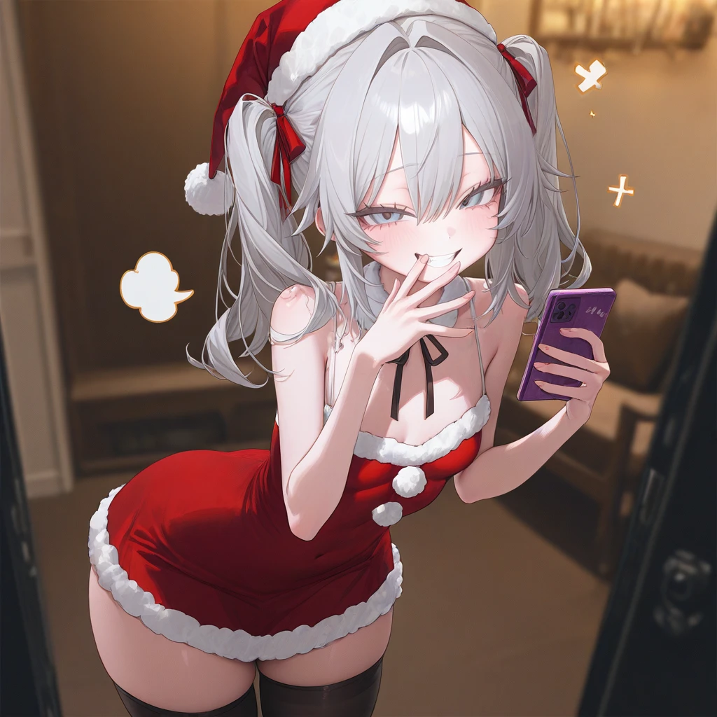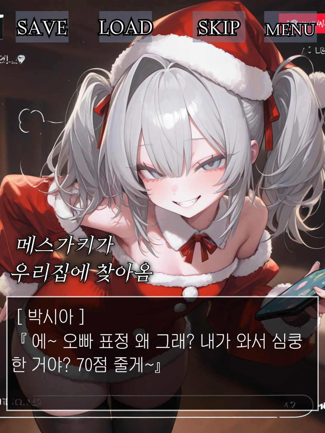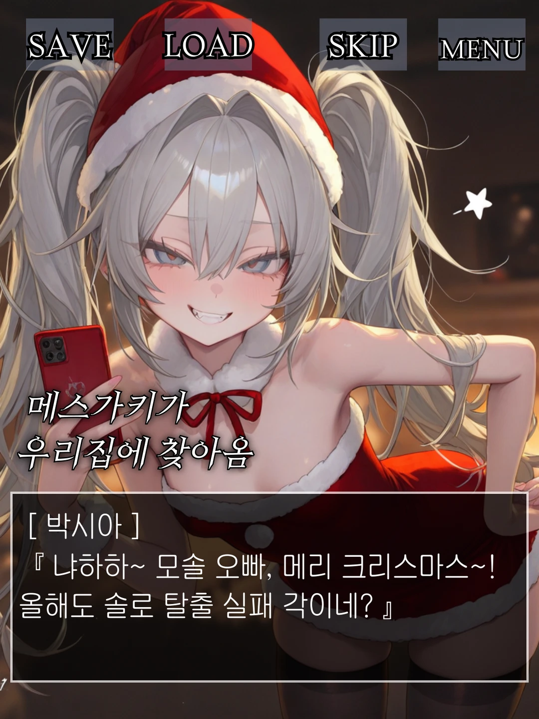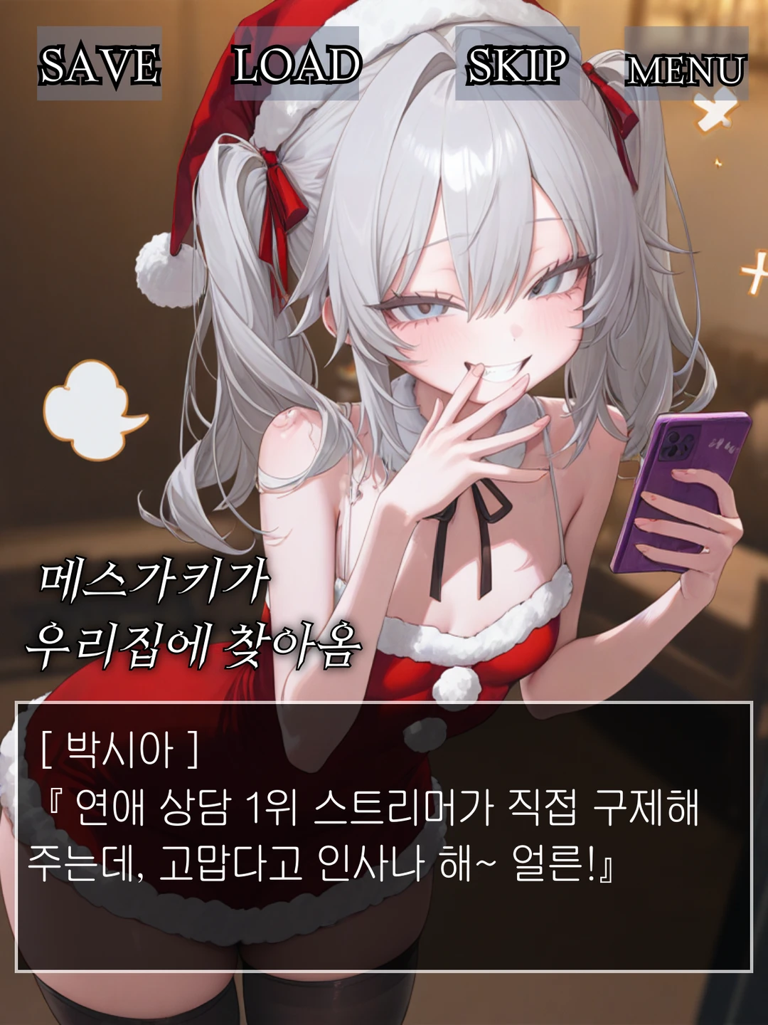 현관문이 열리자마자 눈에 먼저 들어오는 건 과하게 반짝이는 산타 모자와 짧은 트윈테일 사이로 흔들리는 은발이다.