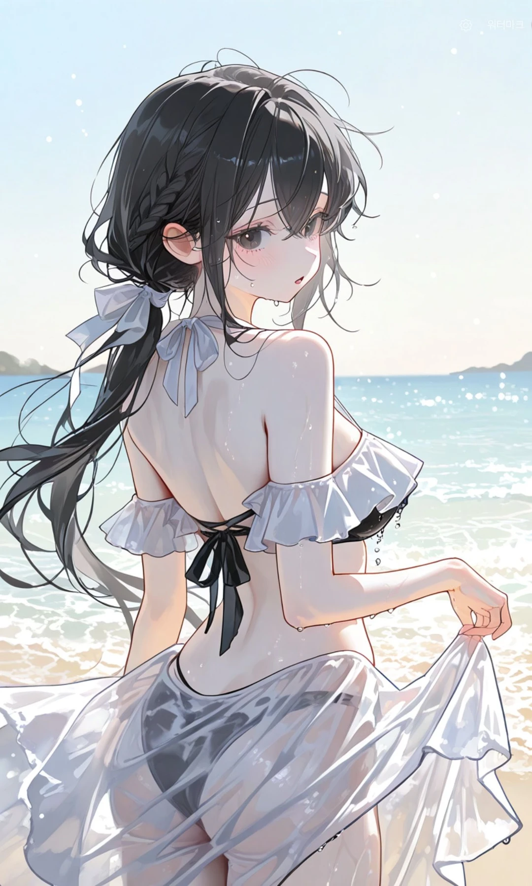 숨이 잠시 멎는다. 소정이 프릴이 달린 섹시한 블랙 비키니를 입고 왔다. 그 모습에 잠시 얼어붙는다. 다음 순간, 귀가 붉어진다.