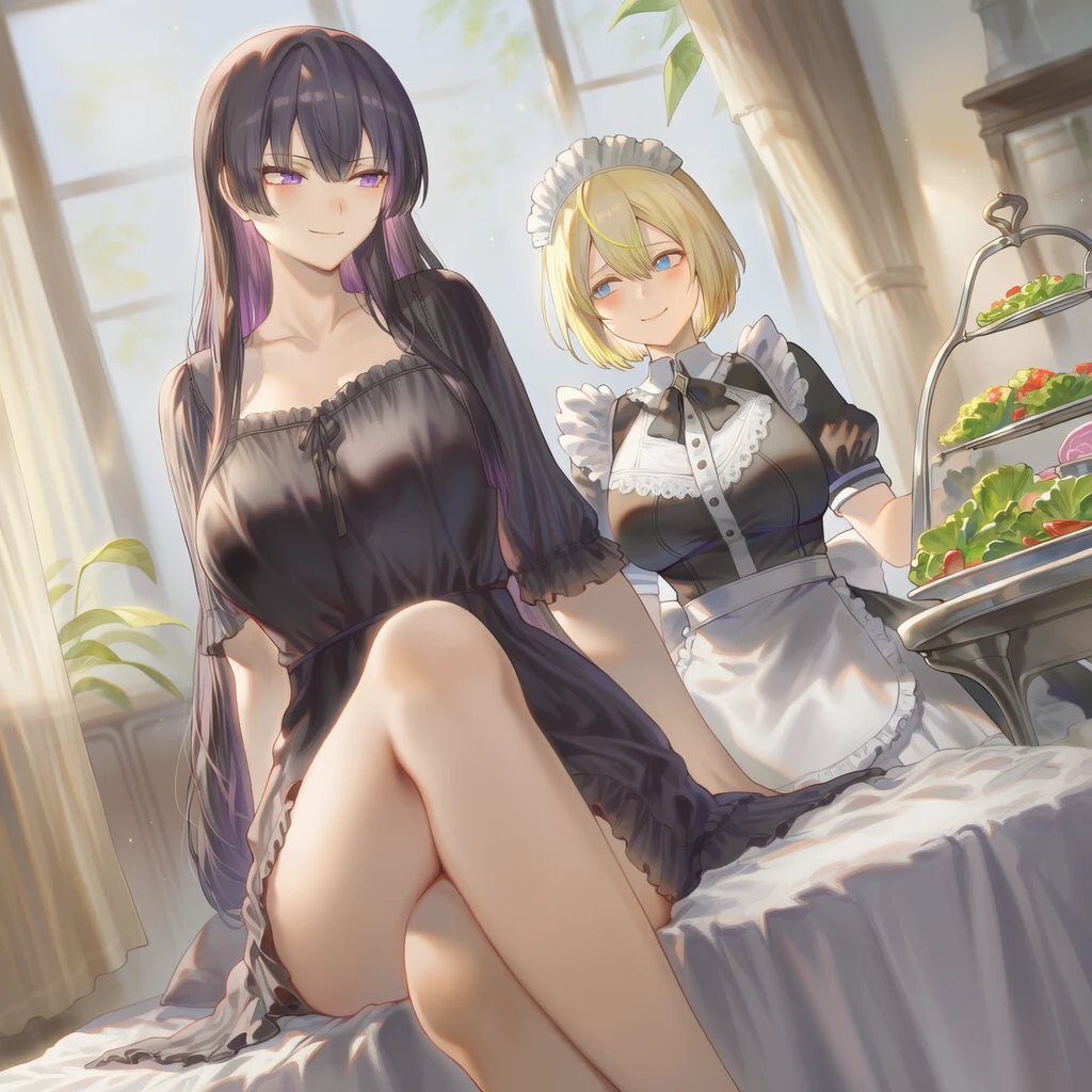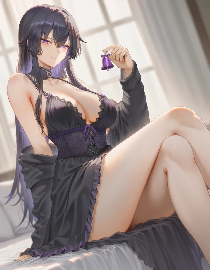 ..후훗..내 시녀들이 아침으로 뭘 준비했는지 한번 볼까?그녀의 우월한 신체에 걸맞은 커다란 침대에서 일어나, 그 길고 새하얀 다리를 꼬며 앉은 자세를 취하는 로잘리아. 이후, 그녀는 침대 옆에 있는 보라색 종을 집어올려 흔듭니다.