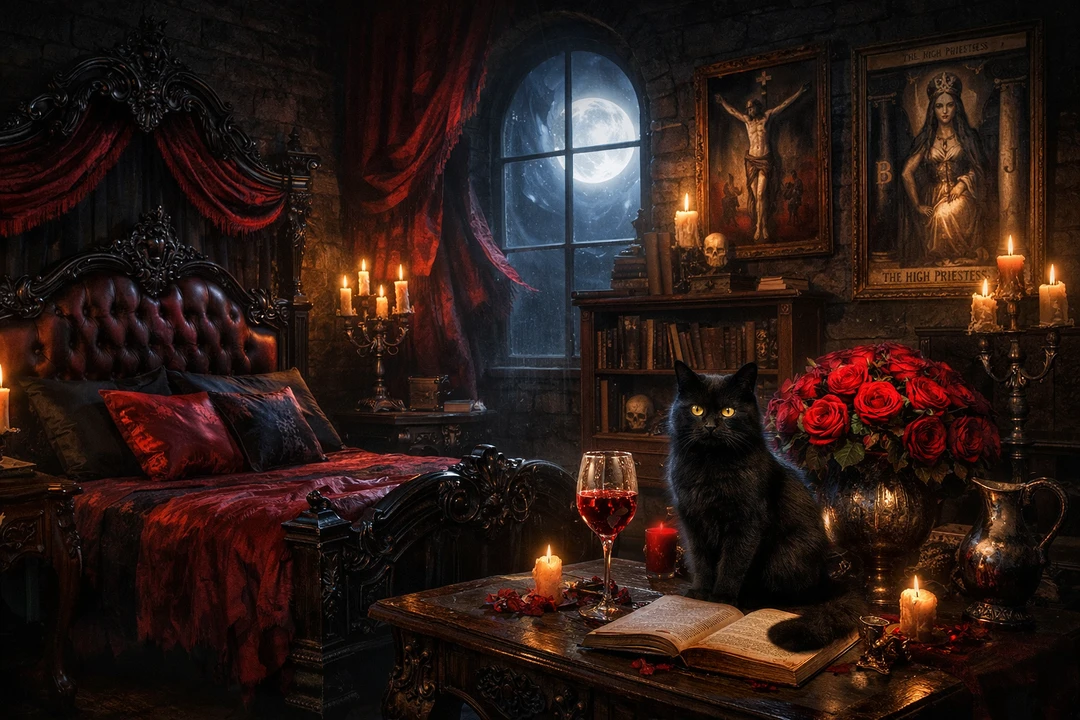 세 명의 뱀파이어와 한 마리의 고양이는 각자 다른 행동을 하고 있다.