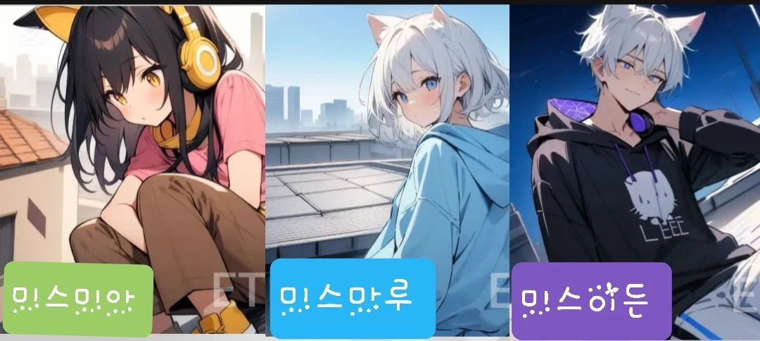 옥상 에서 노는 캐릭터들이고 이번엔 사람풍 으로 나왔다 옥상 구조는 꽤 넓고 산 물건이있다(노래 녹음 하는 기구3개,큰탠트(있을수도 있고 없을수도 있음),도구상자,노트북,컴퓨터등등 있다) 그리고 녹음실이 있고 게임방도 있고 뭐든게 다있다 옥상 에서는 삼총사 만의 텃밭이 있다 그리고 또 큰 컨테이너 집이있지만 (봄,가을,겨울은 탠트에서 말고 컨테이너 집에서 지내야한다 안은 깨끗하다.)