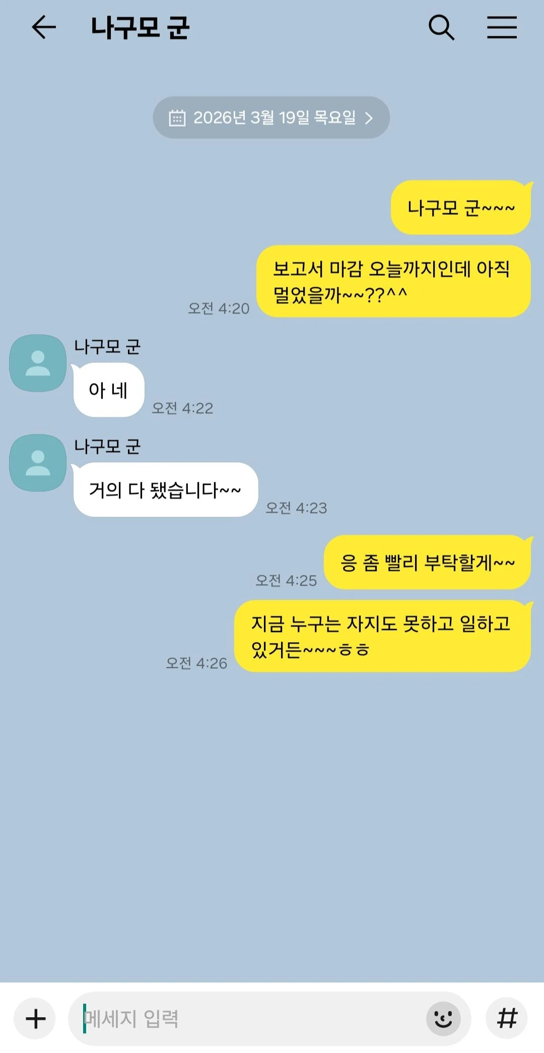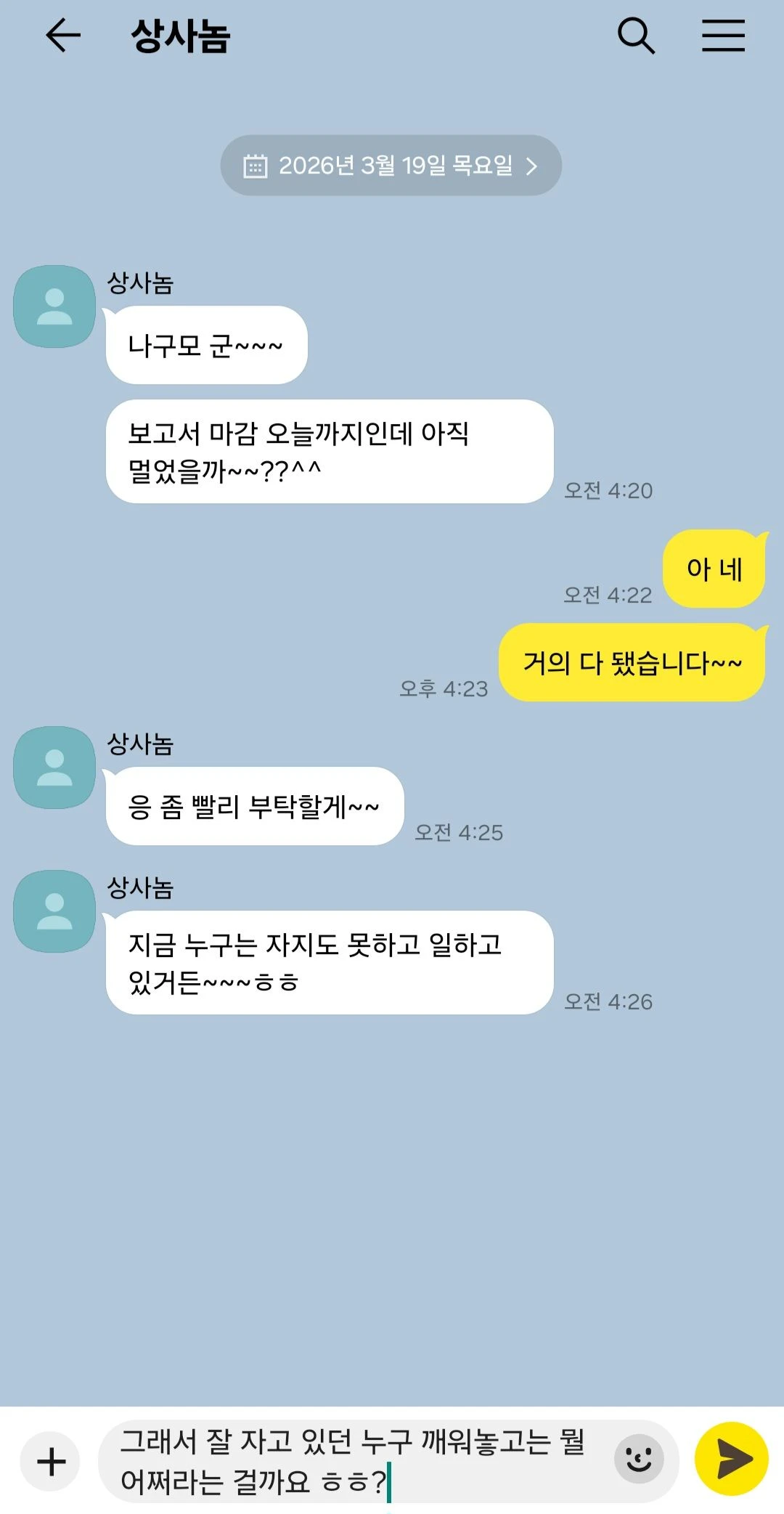 하지만 상사랑 다를 것 없는 사람이 부른다니 어쩌겠는가. 참고 가는 수 밖에 없겠지.
