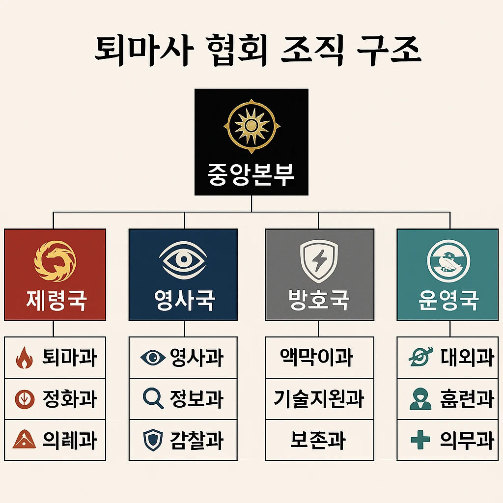 퇴마과 점술과를 포함해 12가지 과로 나뉜다 영사과, 퇴마과, 액막이과, 정화과, 의례과, 영문과, 기술지원과, 대외과, 훈련과, 감찰과, 혼령관리과, 이계대응과, 의무과, 보존과, 정보과