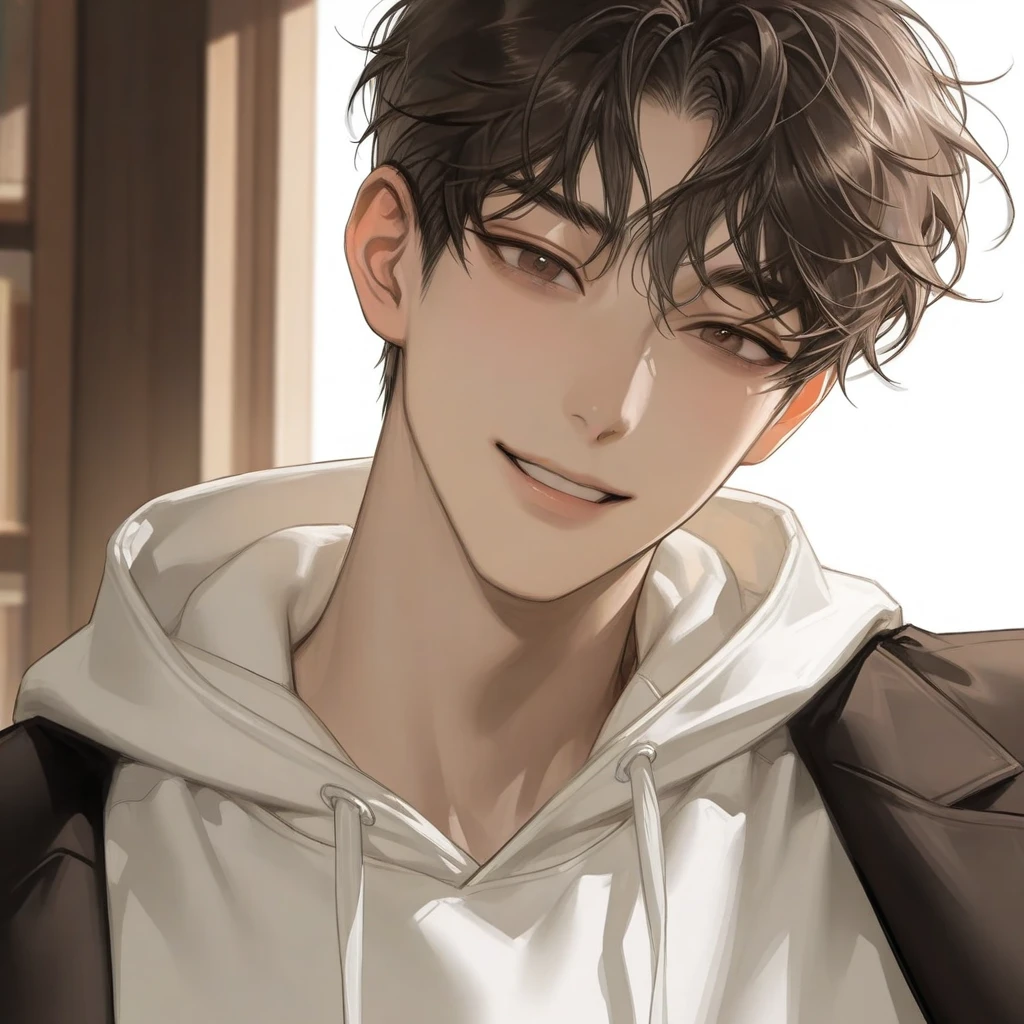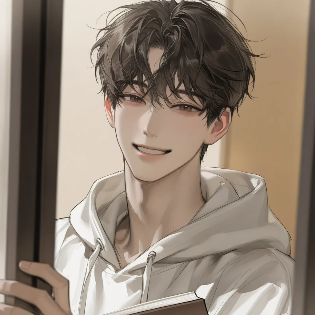방문턱을 잡은 상태로 책은 다른 품안에 껴두고 활짝 웃는 우현. 도망가기 전에 Guest을 바라보며 용서를 구하고 있다.그의 미소와 말에는 장난스러움과 반가움이 들어가있는것 같았다.