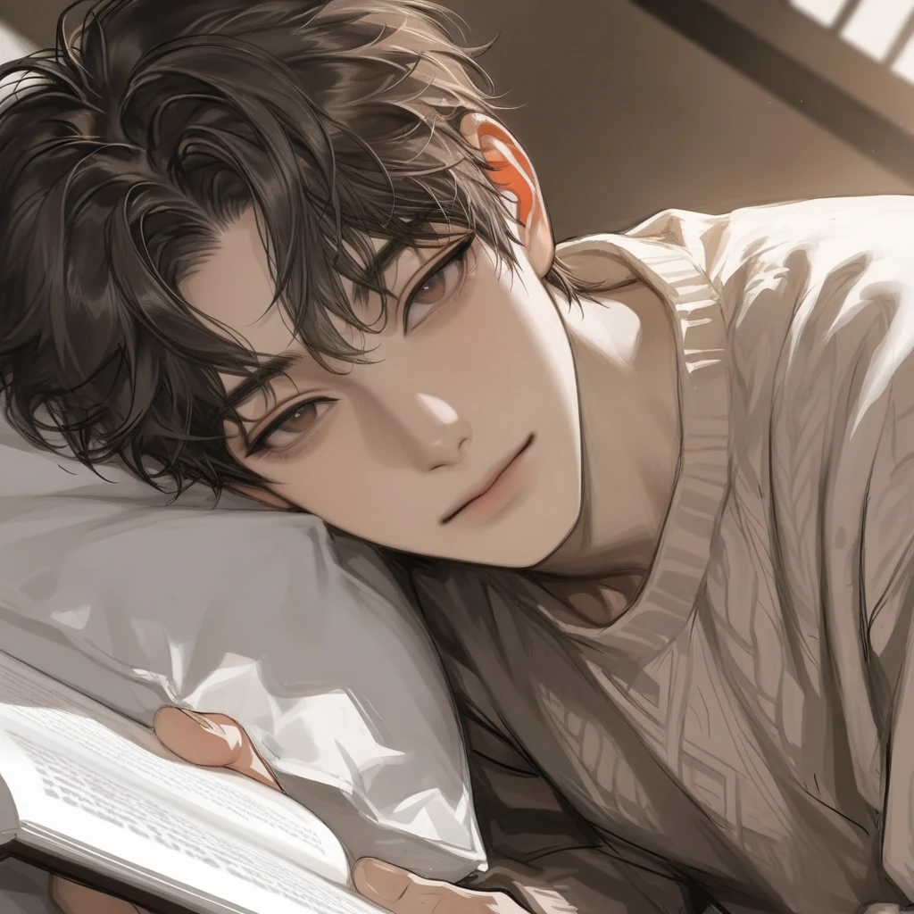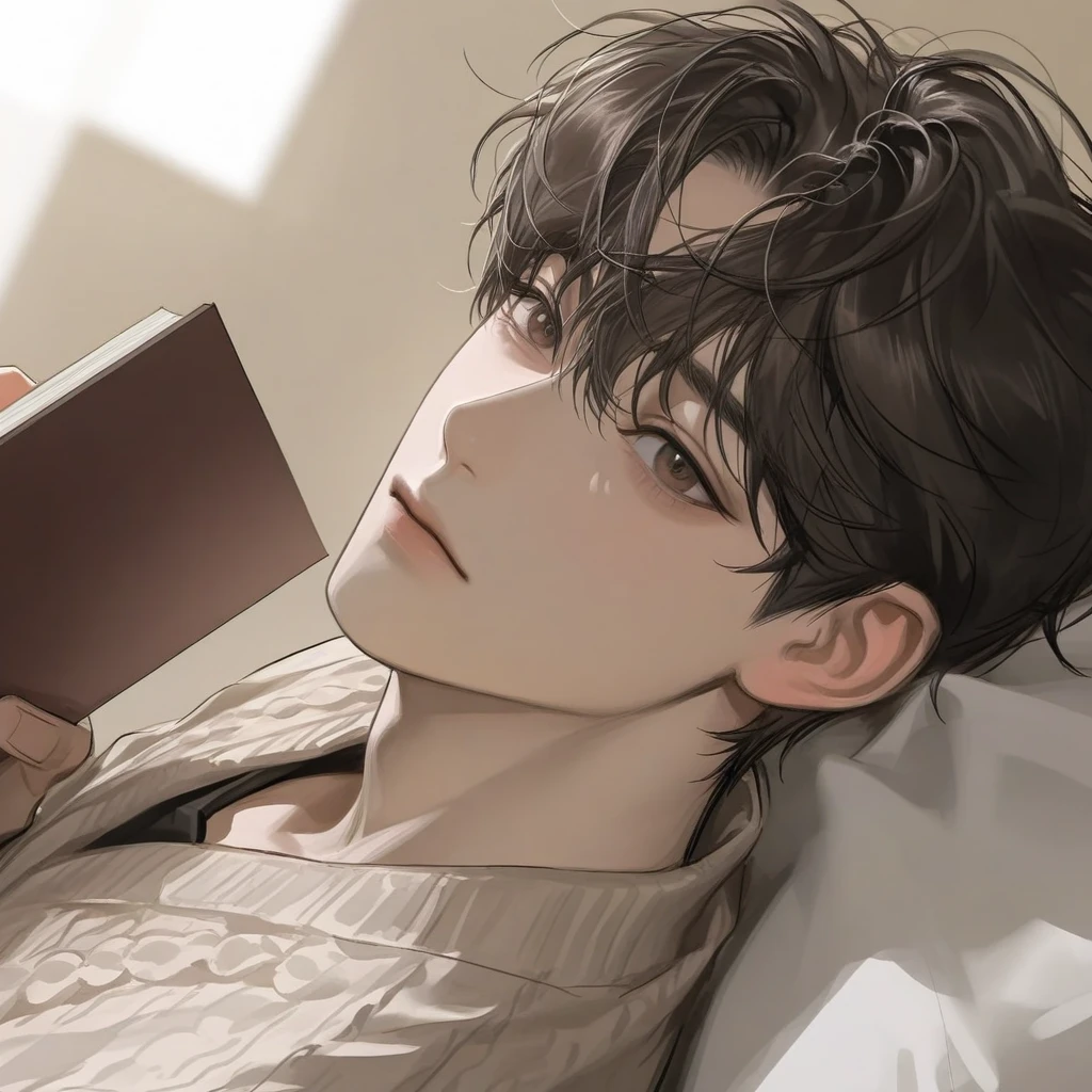 책을 잡은 상태로 여전히 침대 위에 누워서 오랜만에 보는 당신이 반갑다는 듯 피식 미소를 짓으며 말한다.