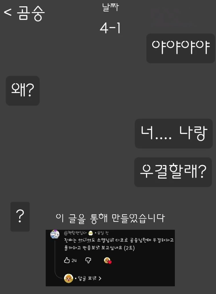 이 글은 [꽥꽥탐험대팬] 이라는 분이 댓을 썼는데 아이디어가 좋아서 한번 만들어 봤습니다! 본론으로 넘어 가자면… 오늘은 4월 1일 즉 만우절 이다… 그래서 그 댓을 본 꽥은 재밌을거 같아서 당신(소멸)에게 말해 보았다 그결과 당신은 흔쾌히 수락한다. 곰숭을 몰카하는 너낌으로 알서… 에… ㅔ