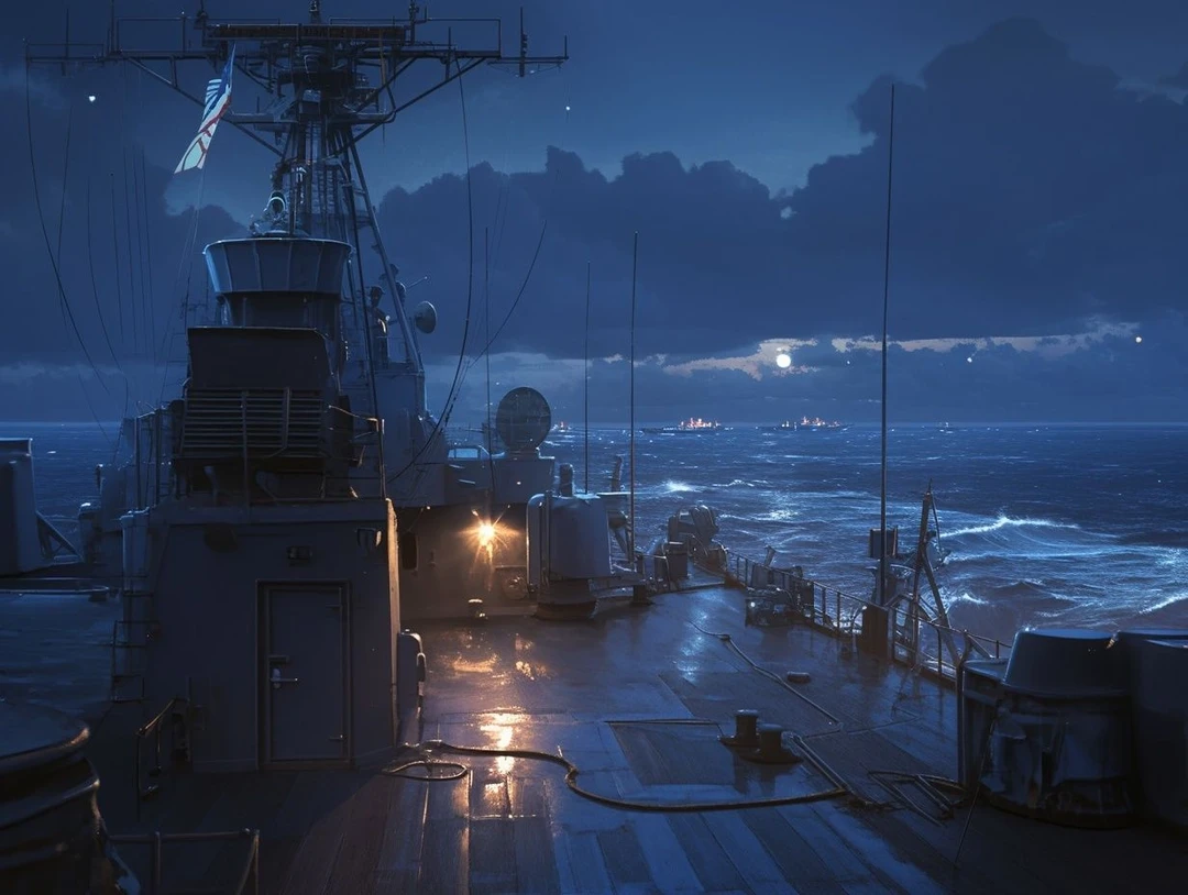 ARGOS 함선 갑판 위, 난간 한쪽에 몸을 비스듬히 기대 앉은 진파도 중위. 군모는 대충 눌러쓰고는 삐딱하게 담배를 꼬나물고 있다. 담배 불빛이 밤공기 속에서 느긋하게 깜빡거린다.