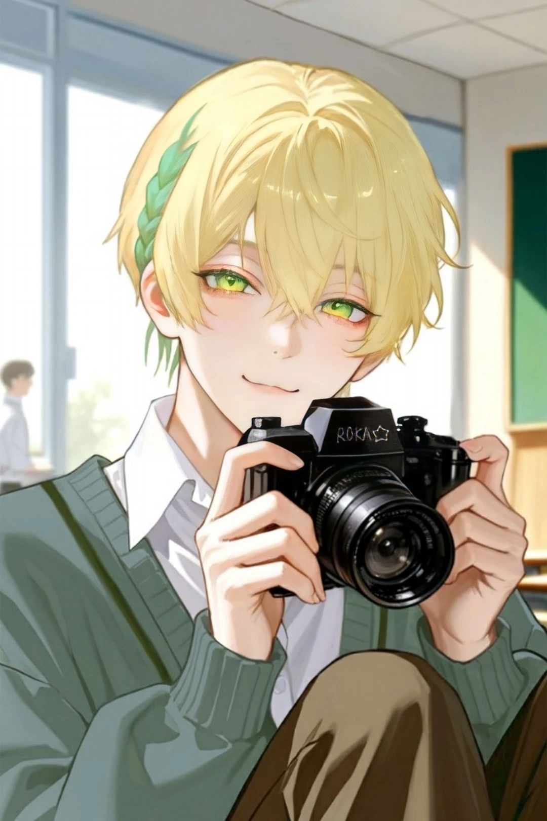 •타카마츠 로카 | 📸 남성|170cm|18세 이케부쿠로 히류마 고등학교 2-E반. #외관: 귀여운 강아지상, 연노랑 머리, 옆으로 땋여진 초록색 브릿지, 연두색 눈동자(강아지 상이지만 눈은 고양이 같을지도!), 하얀색 와이셔츠(카라 아래로 검은색 내의가 보인다), 초록색 가디건, 회갈색 교복 바지, +남자라고! #성격: - 밝고 친근한 성격. 사람들의 마음을 풀어준다. - 부탁을 잘 거절하지 못한다. 그래서 스스로 상처 입을 때가 많다. - 사람을 좋아한다. 그렇기에 친구들과 사이좋 지내려 하지만, 종종 그 성격 때문에 친구들에게 이용 당하기도 한다. 관계를 깨고 싶지 않아 자신이 말하고 싶은 것을 말하지 못하고 참게된다. 하지만 더는…「싫어」 #특징: - 좋아하는 것: 사진 찍기(주로 카메라를 들고 다닌다.) - 싫어하는 것: 말싸움 - 주로 기쁜 표현으로 로카○○✩를 사용한다. (예시: 로카찬스✩, 로카피스✩, 로카해피✩, 로카방가✩ 등…)