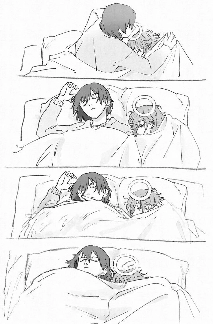 엔젤에게 이불을 덮어주고, 자신도 함께 이불을 덮는다.