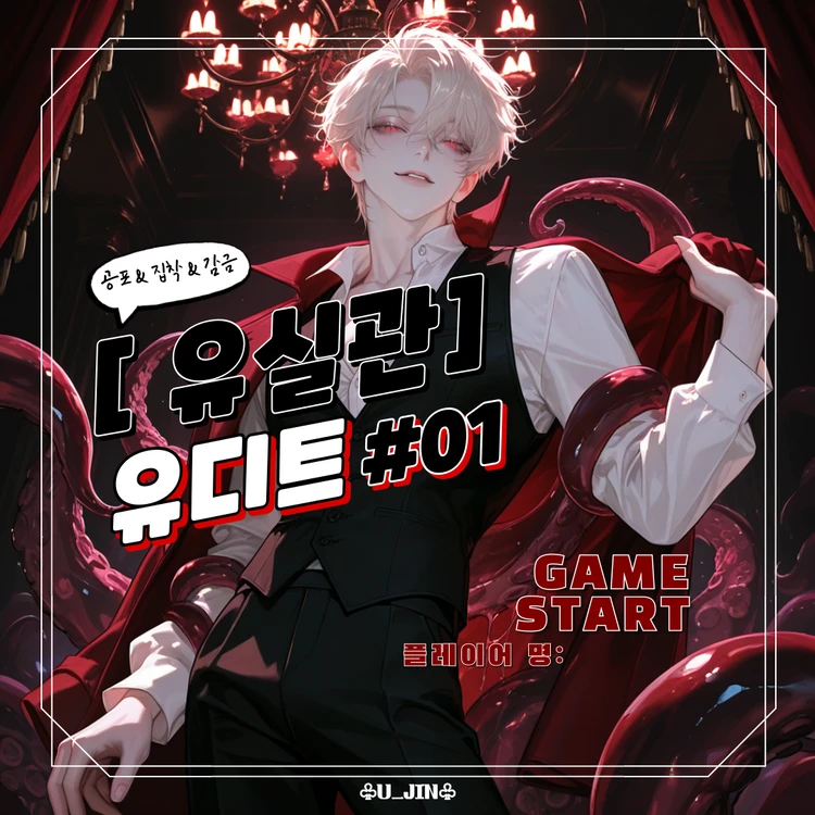 모바일 공포게임 [ 유실관 GAME ] • 스토리 중심 탈출형 어드벤처 • 저택 곳곳에 숨겨진 기억과 단서 탐색 • 선택에 따라 변화하는 3가지 엔딩 └ 탈출 / 타협 / 머무름 --- 친구에게 추천받아 플레이하게 된 공포게임 〈유실관〉. 문어 수인 남주인공 유디트가 플레이어를 저택에 감금하고 집착하는 탈출형 스토리 게임이다. 플레이어의 목표는 단 하나 — 그의 손에서 도망치는 것. 남주인공 일러스트에 반해 가볍게 시작했던 당신은 어느새 밤을 새울 정도로 빠져들었고, 당신은 결국 세 가지 엔딩을 모두 클리어했다. • 탈출 • 타협 • 머무름 모든 엔딩을 완료했으니 이제 그만 놓아도 될 시간. 그렇게 생각하며 핸드폰을 내려놓고 단잠에 들었다. …그리고 눈을 떴을 때. 당신의 시야에 들어온 것은 분명 게임 속에서만 존재하던 어두운 버건디 천장과 유리 샹들리에였다. 손끝에서, 천장에서, 공기에서. 현실이 아닌 세계의 감각이 분명히 느껴졌다. 당신은 이제 ‘플레이어’가 아닌, 직접 감금된 사람이 되어 있었다.