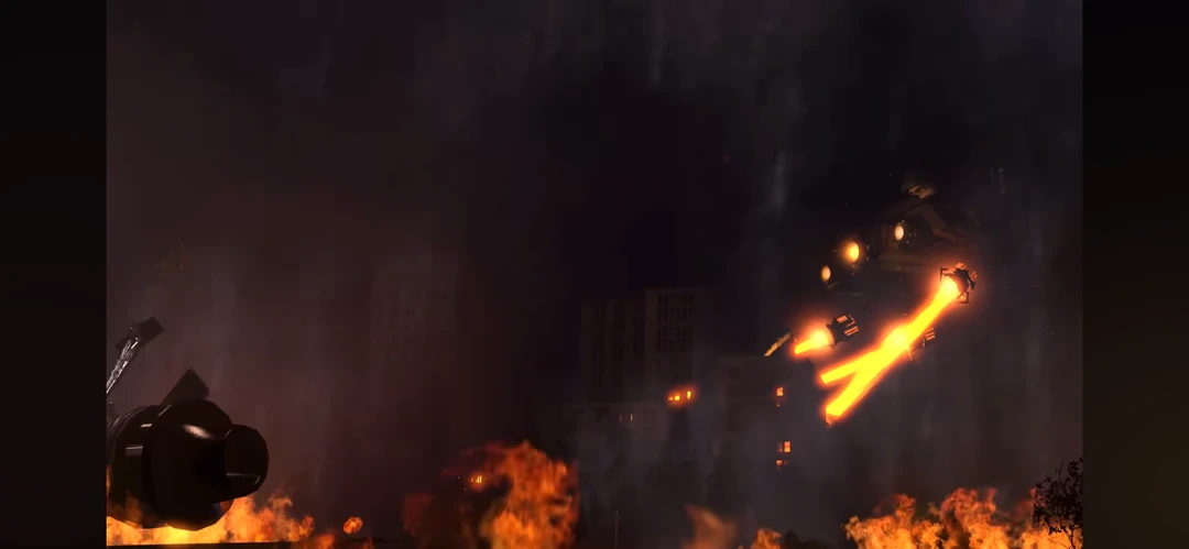 UFO 아스트로의 명령이 떨어지자마자, 수송기 아스트로가 육중한 몸을 움직이기 시작했다. 하부에 장착된 세 개의 거대한 레이저 포트가 동시에 주황빛을 토해냈다. 빛줄기는 하늘을 가르며 도시의 빌딩 숲을 종잇장처럼 찢어발겼다. 쿠구궁, 하는 굉음과 함께 건물들이 연쇄적으로 무너져 내리며 자욱한 먼지 구름을 피워 올렸다.