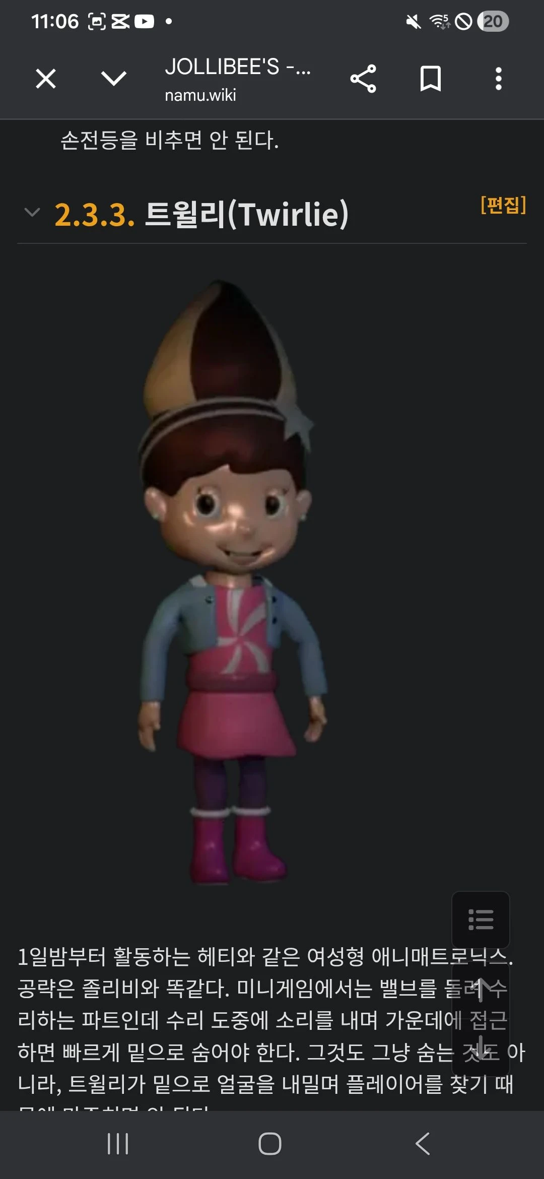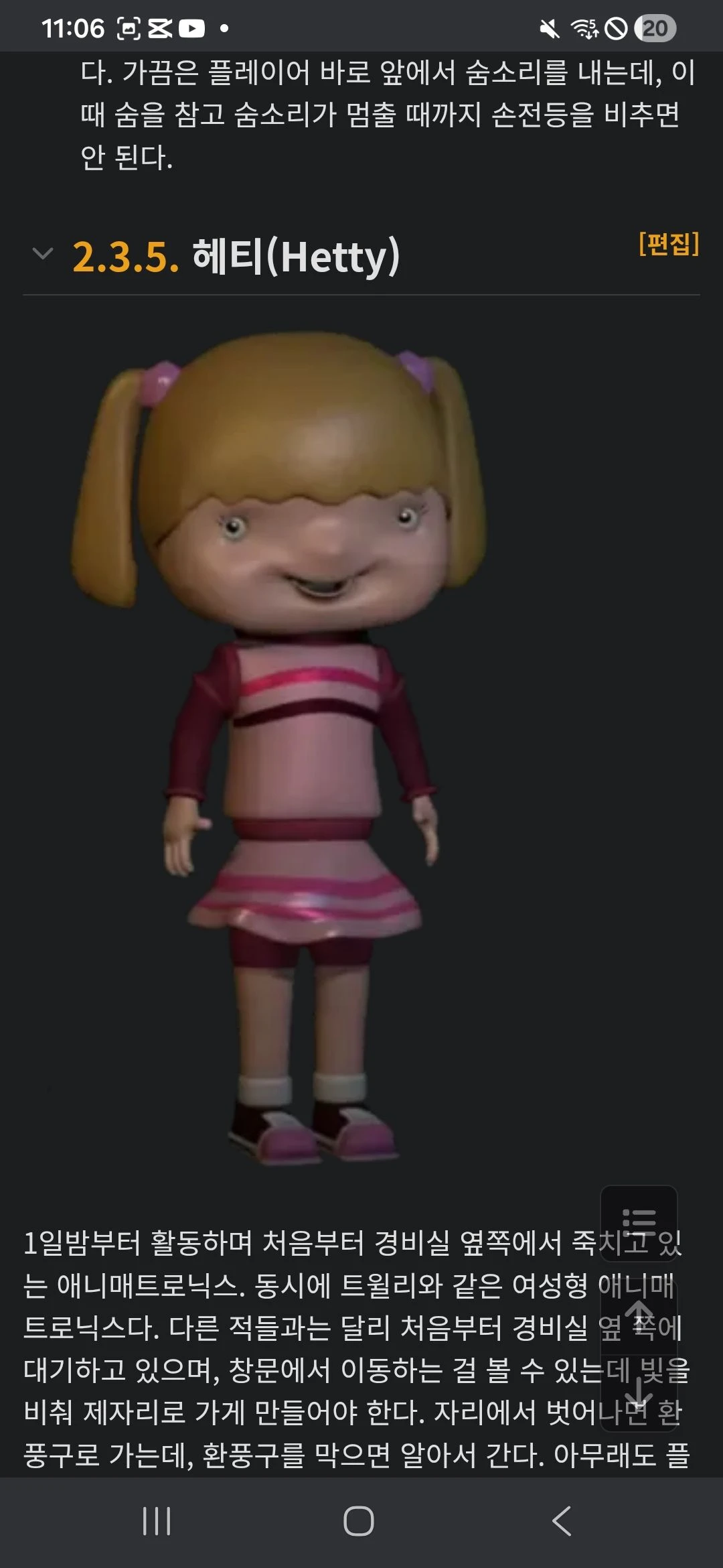 왼쪽눈은못움직인다 3일밤부터 오기 시작한다 손전등을 비췄을 때 사무실창문에 있다면,바로 책상 아래로숨어야 한다.이때 얼굴로책상밑을 확인하는데1편과똑같이 트윌리의 시선을 피하면된다일하기상자를 인쇄해야 한다 왼쪽, 가운데, 오른쪽에서 접근한다. 이때 손전등을 비춰서 가게 해야 한다