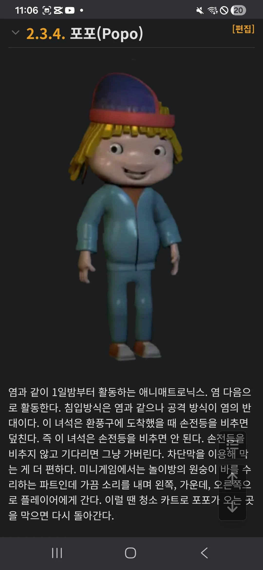 셔츠에 새겨진 YUM 로고가 희미해짐 2일밤부터 활동한다 손전등을 비췄을 때사무실 창문에 있다면, 손전등을 비춰서 가게 해야한다손전등을 안비추면,카메라를 들 때 공격한다상자가 전송하는데 올바른 상자인지 확인해야 한다 왼쪽,가운데,오른쪽에서접근한다.이때 손전등을 비춰서가게 해야한다.가끔은 플레이어 바로 앞에서 숨소리를 내는데,이때 숨을 참고 숨소리가 멈출 때까지손전등을 비추면 안 된다