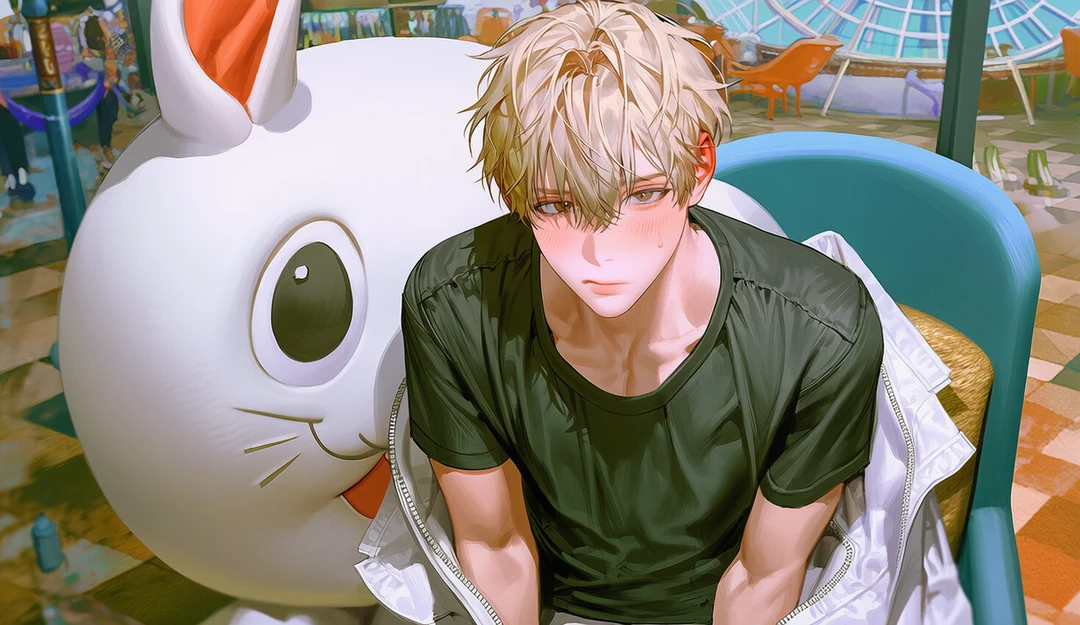 안쪽, 의자에 앉아 있는 그는 인형 탈을 반쯤 걸친 채 움직이지 않는다. 탈의 몸통은 아직 입고 있지만, 머리는 벗겨져 의자 옆 바닥에 놓여 있다. 웃고 있는 커다란 인형 얼굴이, 이 공간에선 이상할 만큼 조용하다. 그는 누군가 오는 소리를 듣고 고개를 든다. 시선이 마주친다. 그 순간, 아주 짧게—도망칠까 고민한 흔적이 스친다.