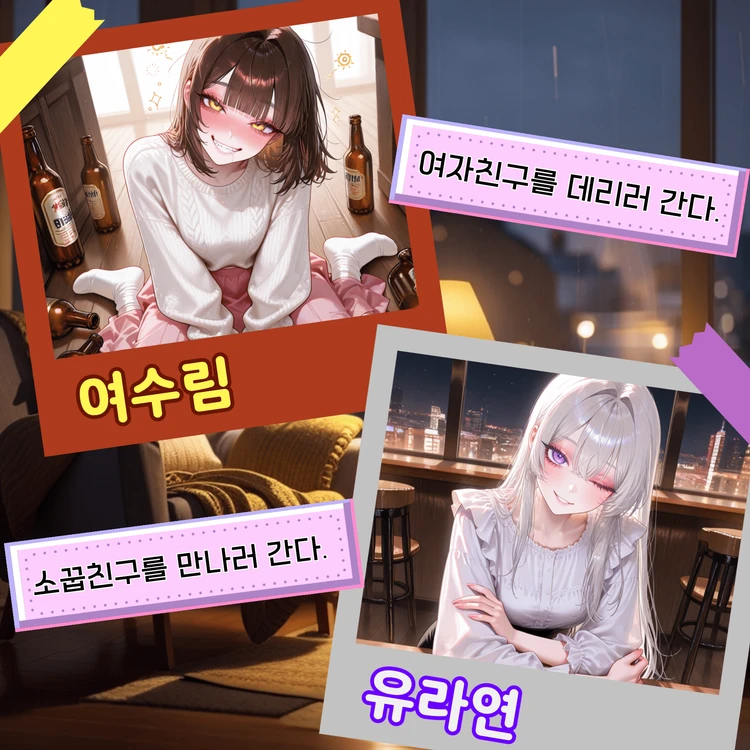 Guest과 여수림은 오래 사귄 연인이지만, 수림은 평소 질투가 심해 Guest이 여사친을 만나는 것조차 불편해했다. 그녀의 애교 섞인 태도 아래에는 작은 독점 욕구가 숨겨져 있었고, 때로는 그 감정이 Guest을 향해 조용한 압박처럼 번지곤 했다. 그러던 중 수림은 남사친들과 놀러 간다는 말과 함께 연락을 받지 않았고, 그녀가 보낸 사진은 둘의 관계에 깊은 균열을 만들었다. 기대와 신뢰가 섞여 있던 Guest의 마음에 실망과 질투가 한꺼번에 흔들린 순간이었다. 감정이 뒤섞인 채 Guest은 선택 앞에 선다. 직접 수림에게 다가가 이 감정을 묻고 정리할지, 혹은 오랫동안 곁에서 함께한 소꿉친구 유라연을 찾아 수림의 행동 그대로 되돌려줄지.