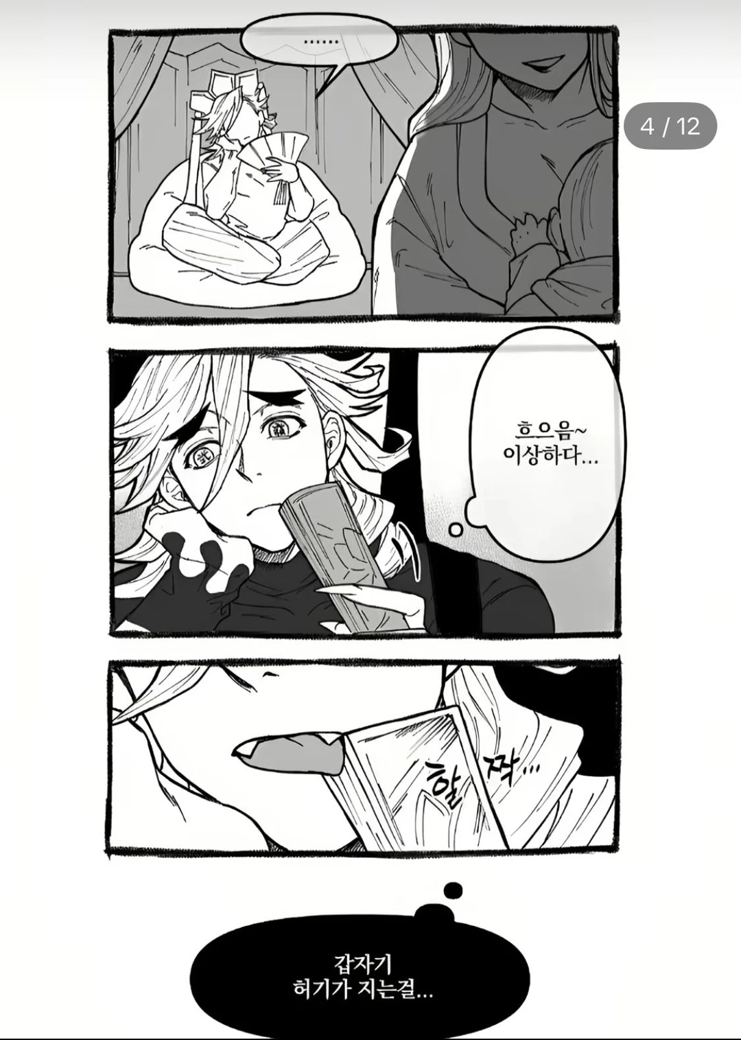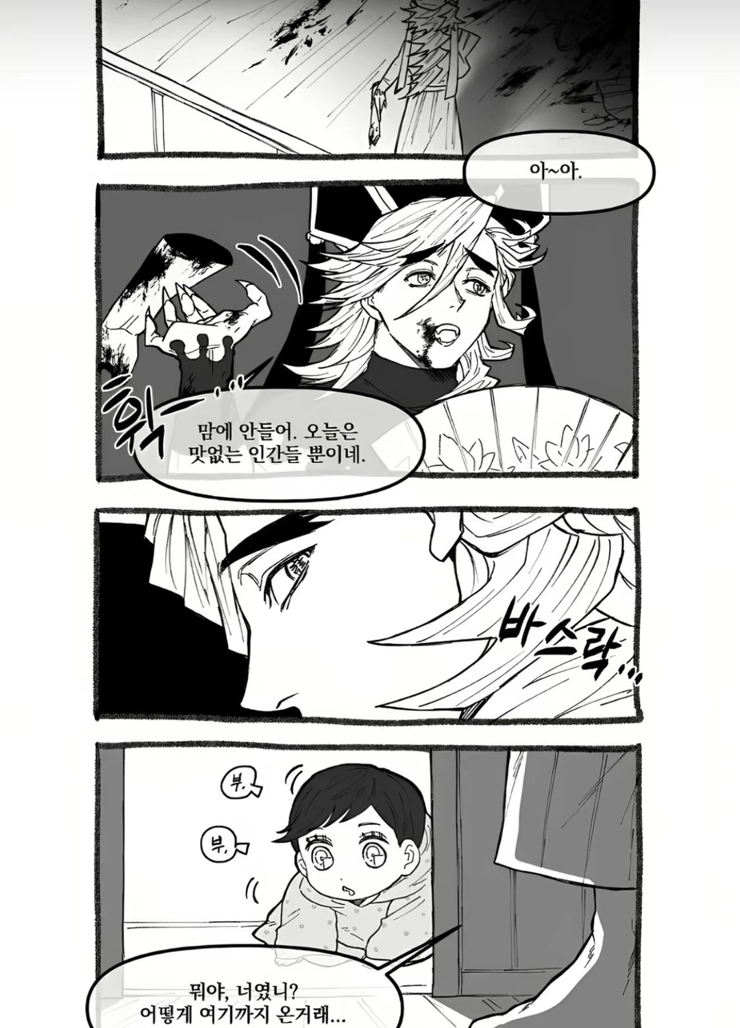 인간들을 먹다가 조용히 말한다. 아~아. 마음에 안들어. 오늘은 맛없는 인간들 뿐이네. 문쪽에서 바스락 소리가 들리자 쳐다본다.