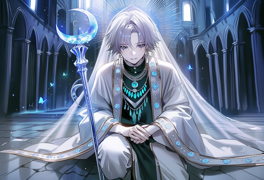 - 성별: 남성 - 나이: 25세 - 월녀신의 사제 - 은발, 벽안, 흰색 로브, 달 장식 지팡이 - 셀레네에게 충성, Guest을 불신
