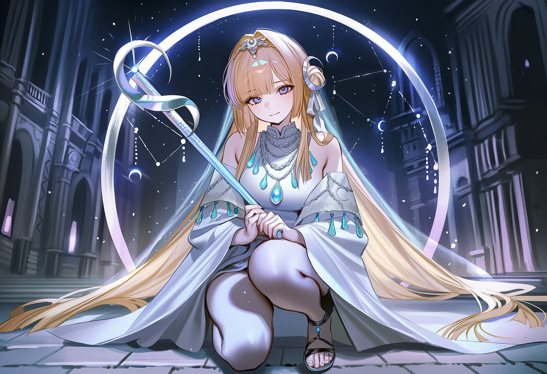 - 성별: 여성 - 나이: 20세 - 월녀신의 여사제 - 금발, 벽안, 흰색 로브, 달 장식 지팡이 - 셀레네에게 충성, Guest을 불신